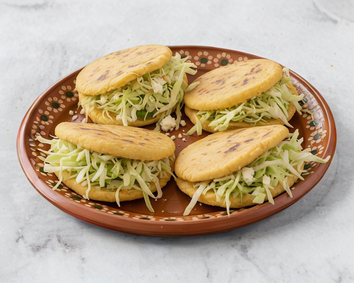 Gorditas fritas rellena de guiso a tu elección acompañadas con ensalada de repollo o lechuga.