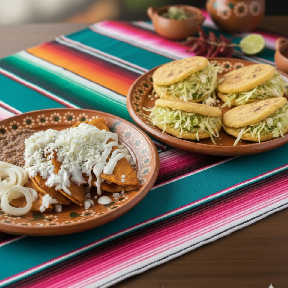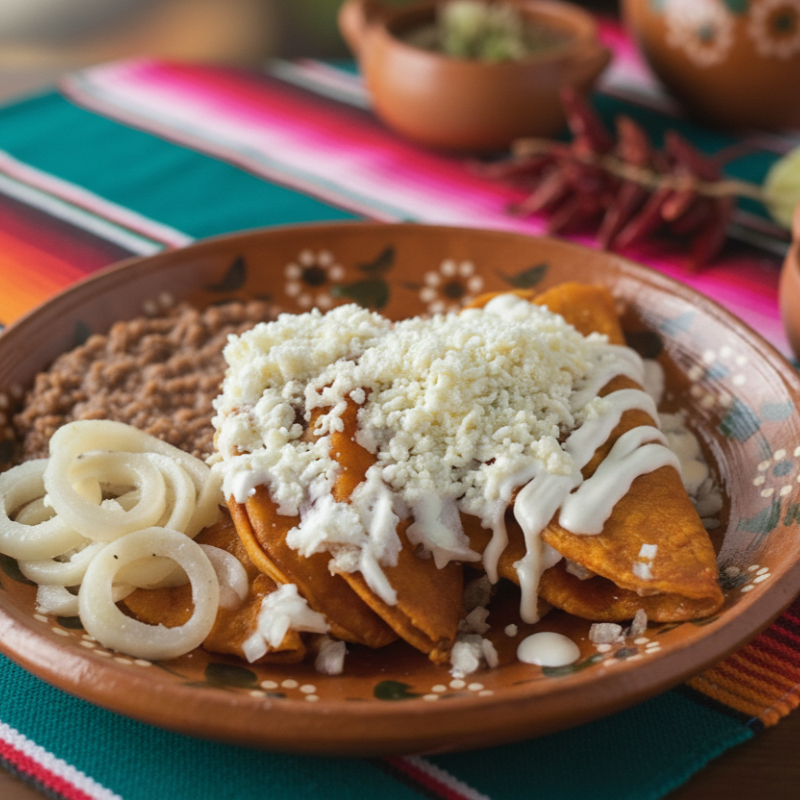 Rellenas de 3 quesos acompañados con frijoles refritos, cebolla picada, crema, queso, salsa roja y cueritos.