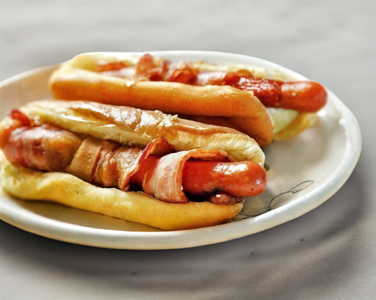 Pan, Salchicha rellena de queso asadero, Tocino, Mayonesa, Jitomate, Cebolla, Cátsup, Mostaza.