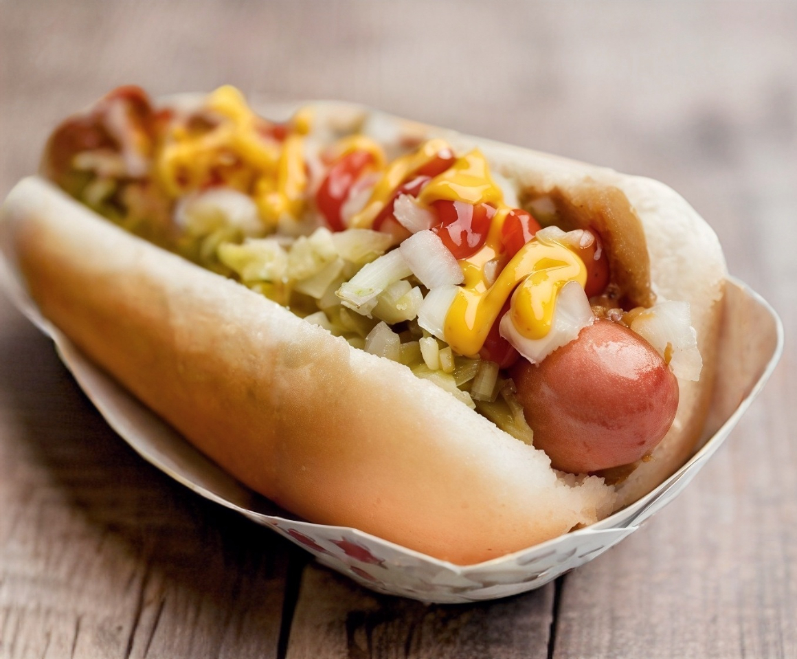 Pan, Salchicha, Mayonesa, Jitomate, Cebolla, Cátsup, Mostaza.
