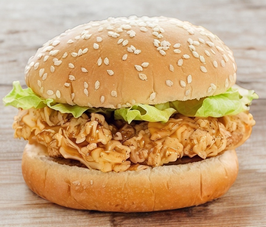 Pan de hamburguesa acompañado de pollo, lechuga, jitomate, cebolla, queso amarillo.