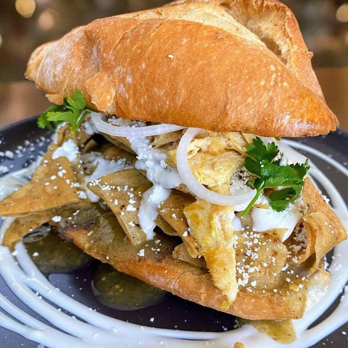 Torta de chilaquiles con la exquisita salsa de tu elección, acompañados de queso asadero derretido, crema de rancho, finas láminas de cebolla y un toque fresco de cilantro.