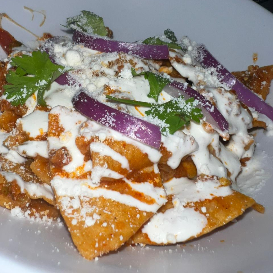 Crujientes chilaquiles cubiertos con una exquisita salsa de frijol y chorizo casera, acompañados de queso asadero derretido, crema de rancho, finas láminas de cebolla y un toque fresco de cilantro.