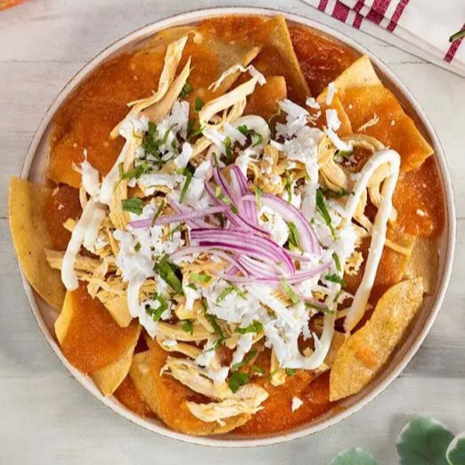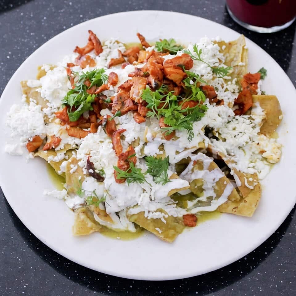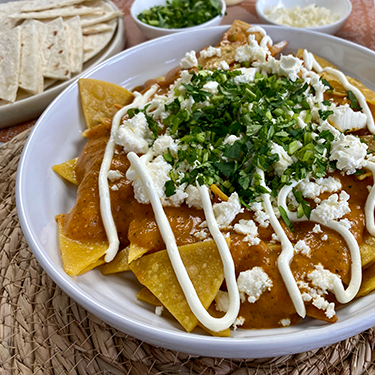 Ricos chilaquiles bañados en tu salsa favorita acompañados de frijoles y toppings favoritos