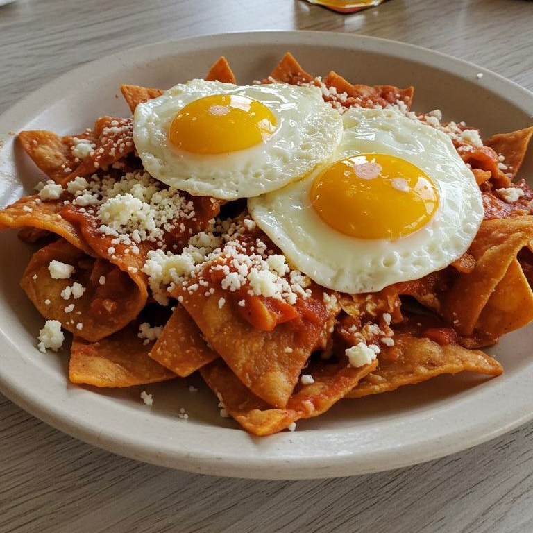 Ricos totopos bañados en la salsa de tu eleccion con 2 huevos estrellados y acompañados de frijoles