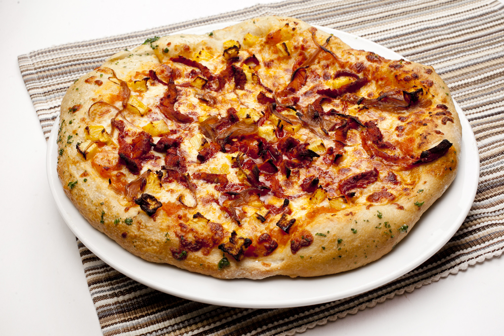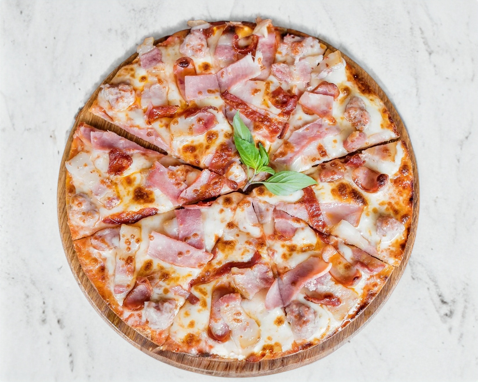 Masa de pizza con salsa de tomate, queso, jamón, tocino y salchicha.