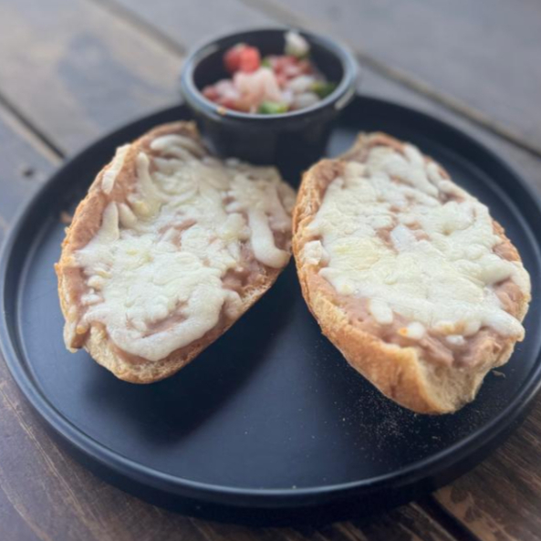 2 piezas de molletes con una base de frijoles, acompañado de una cobertura de queso mozarella, pico de gallo y salsa casera