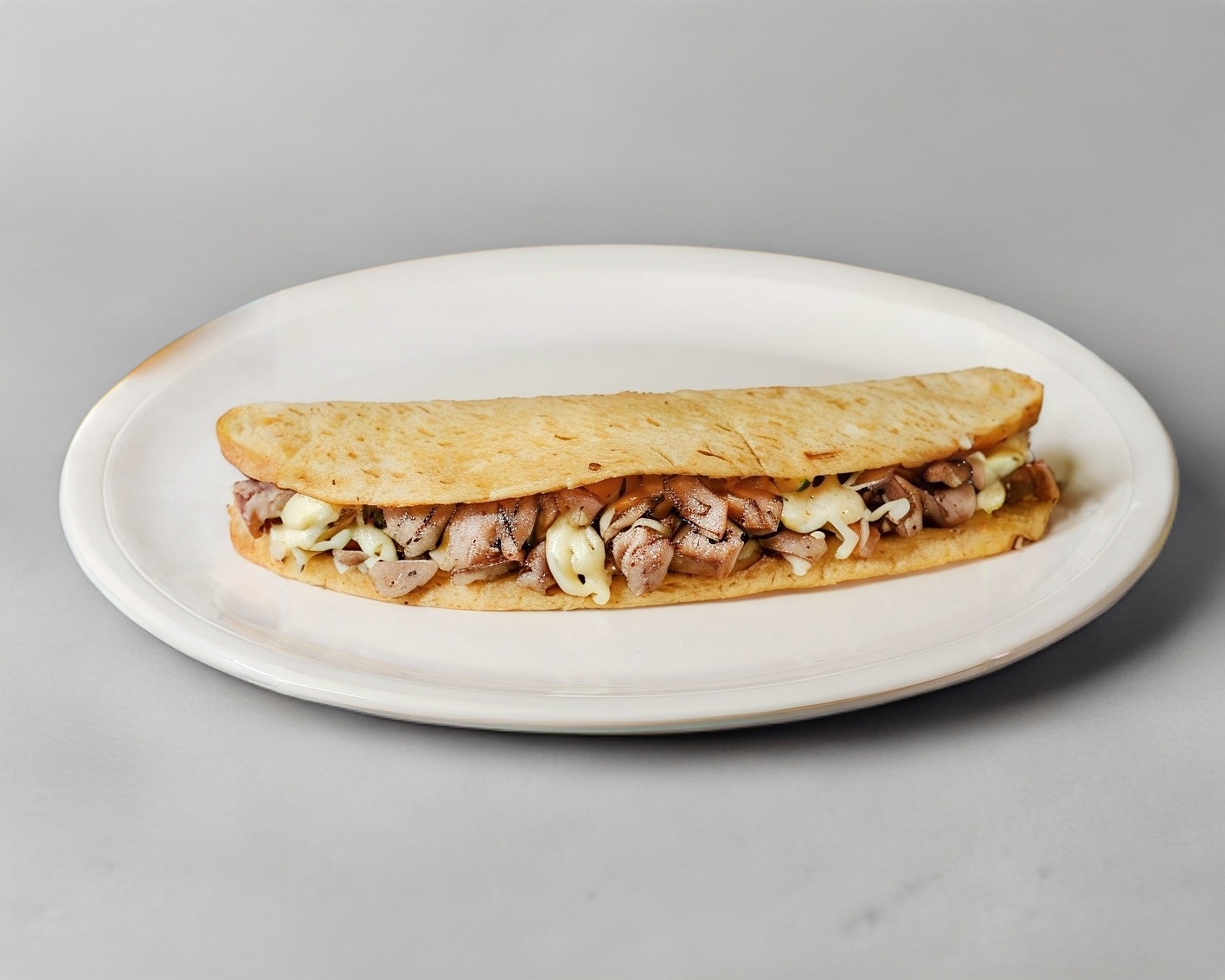 Deliciosa gringa gigante de bistec adobado, morron, chorizo, queso oxaca en 2 tortillas gigantes de harina