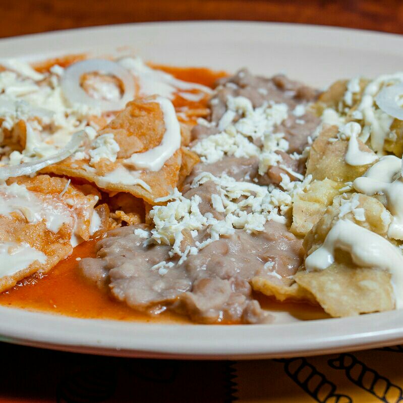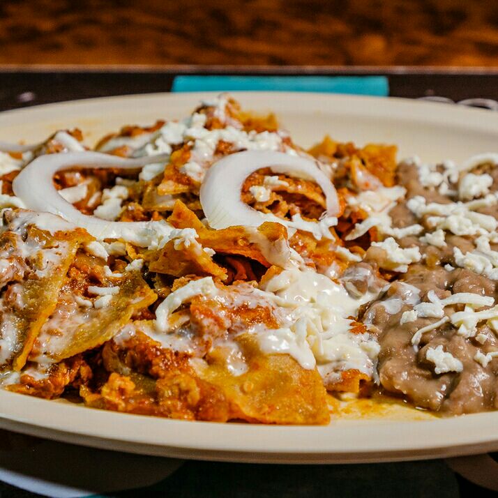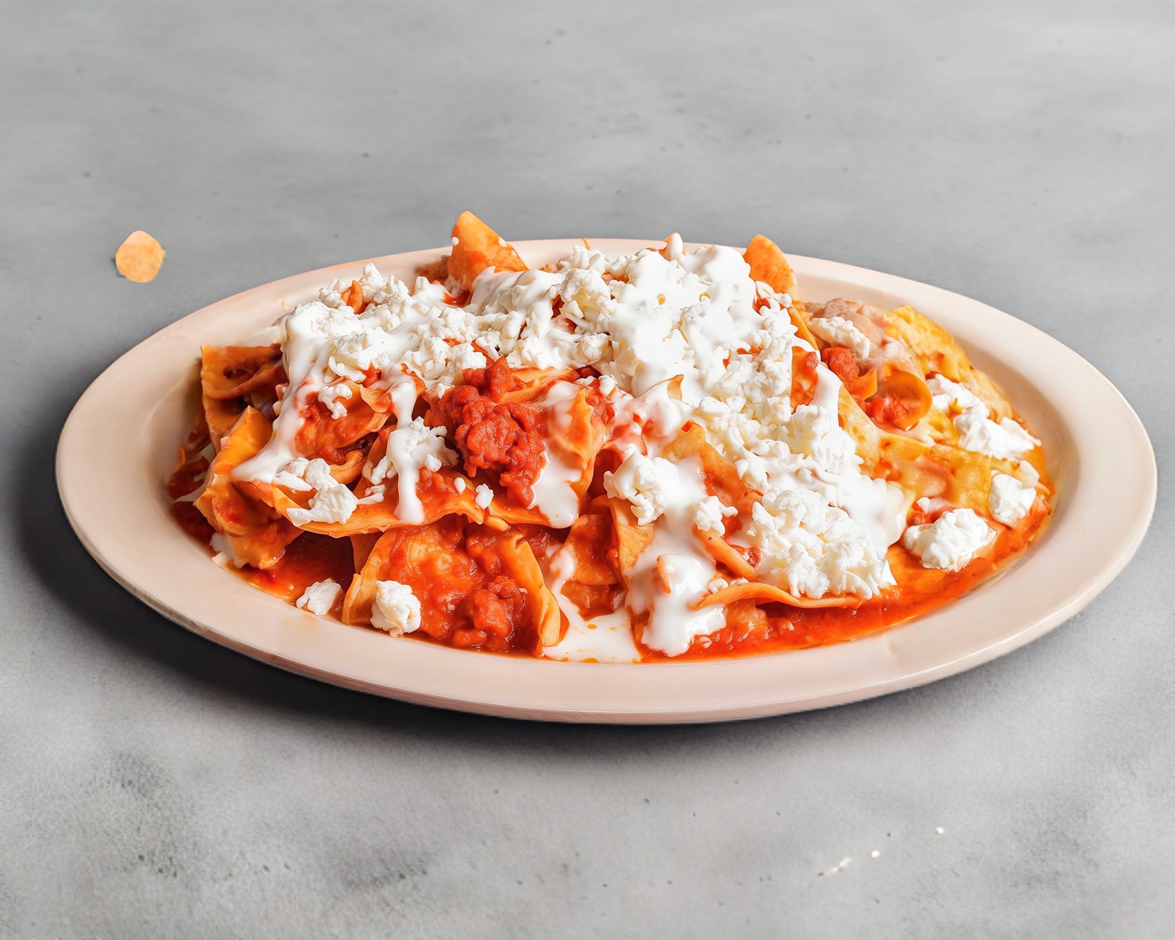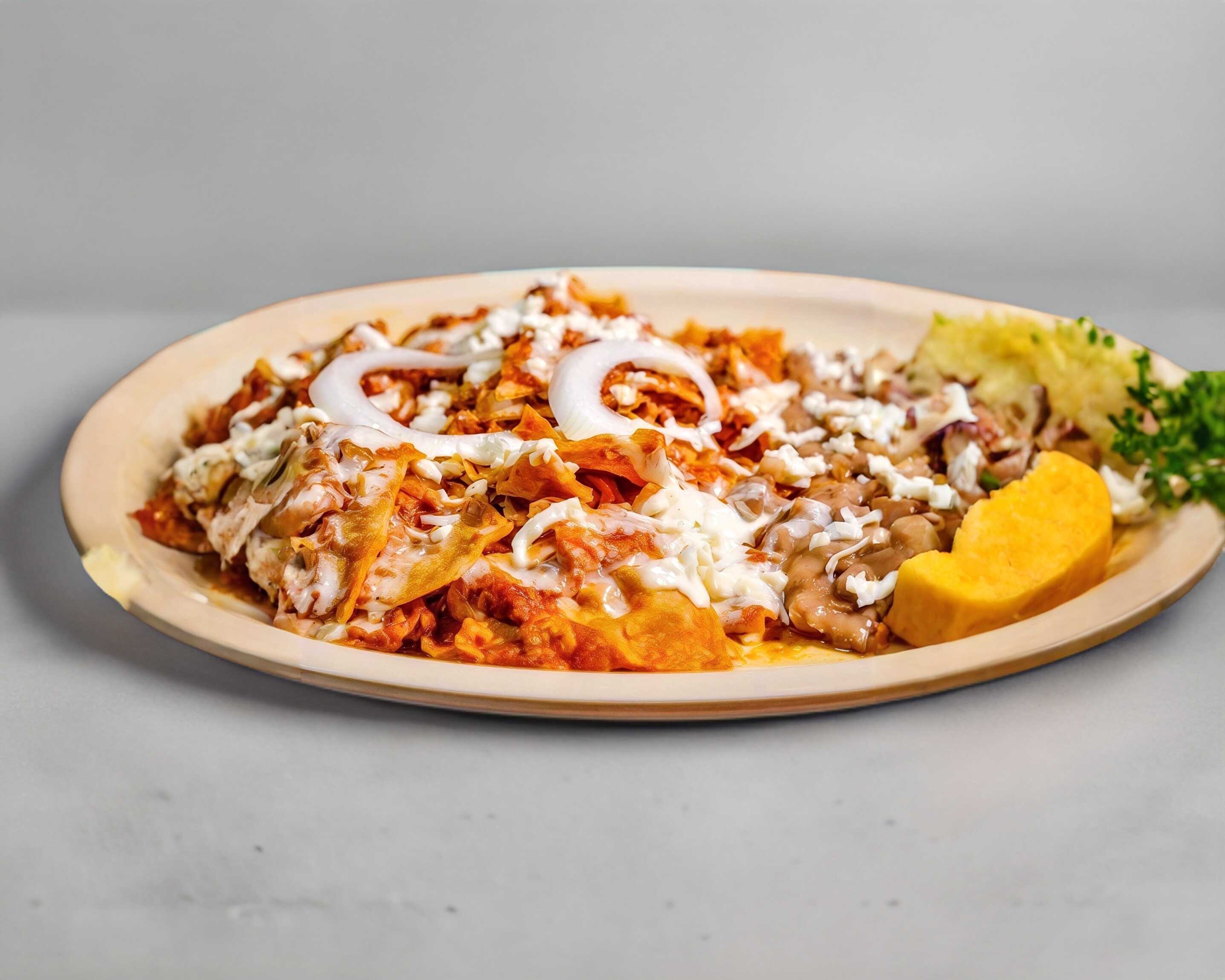 Deliciosos chilaquiles caserosen salsa de chicharron rojo bañados con crema acompañados con frijoles y bolillo