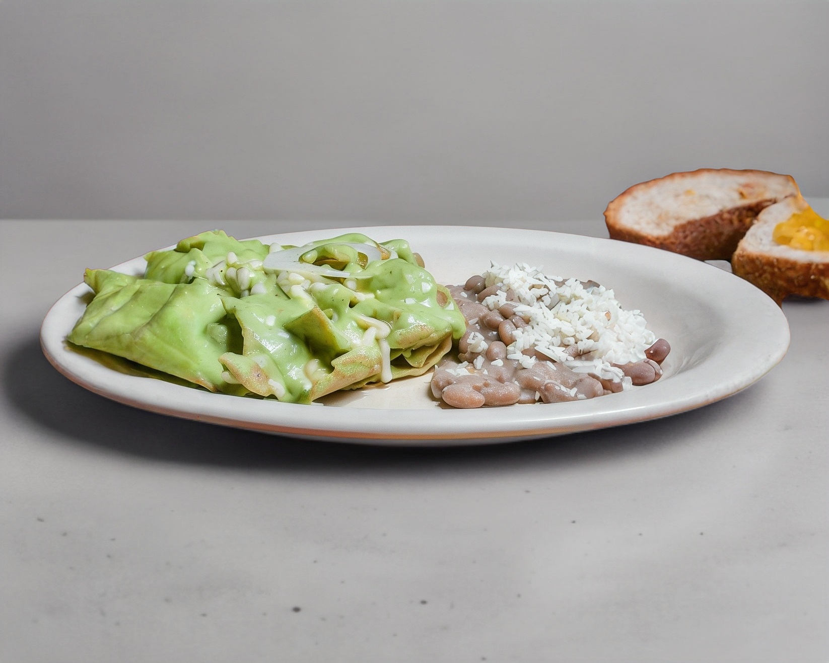 Deliciosos chilaquiles caseros en salsa de cilantro bañados con crema y acompañados de frijoles y bolillo