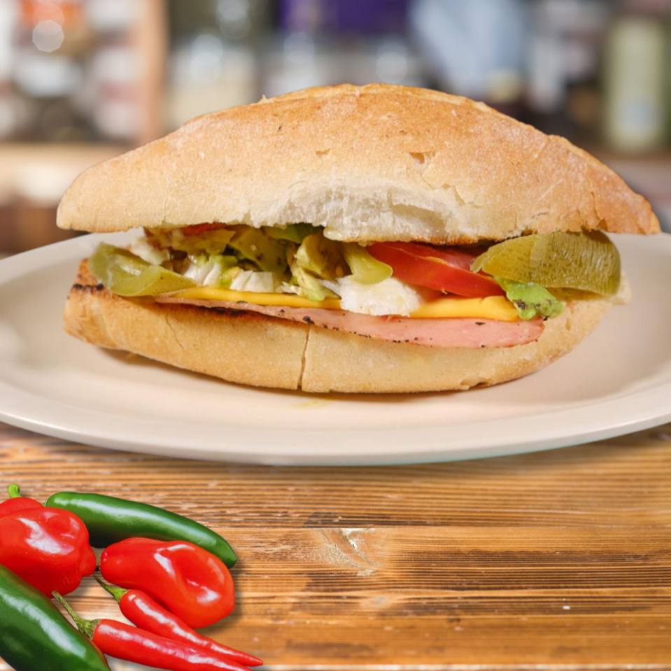 Deliciosa torta de jamon con jamon de pavo y queso americano,lechuga,jitomate,aguacate y chile de vinagre