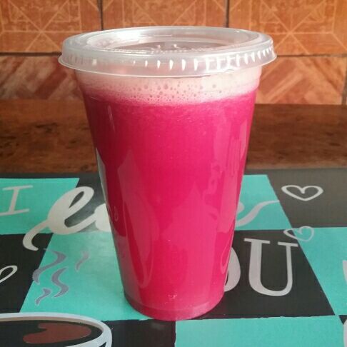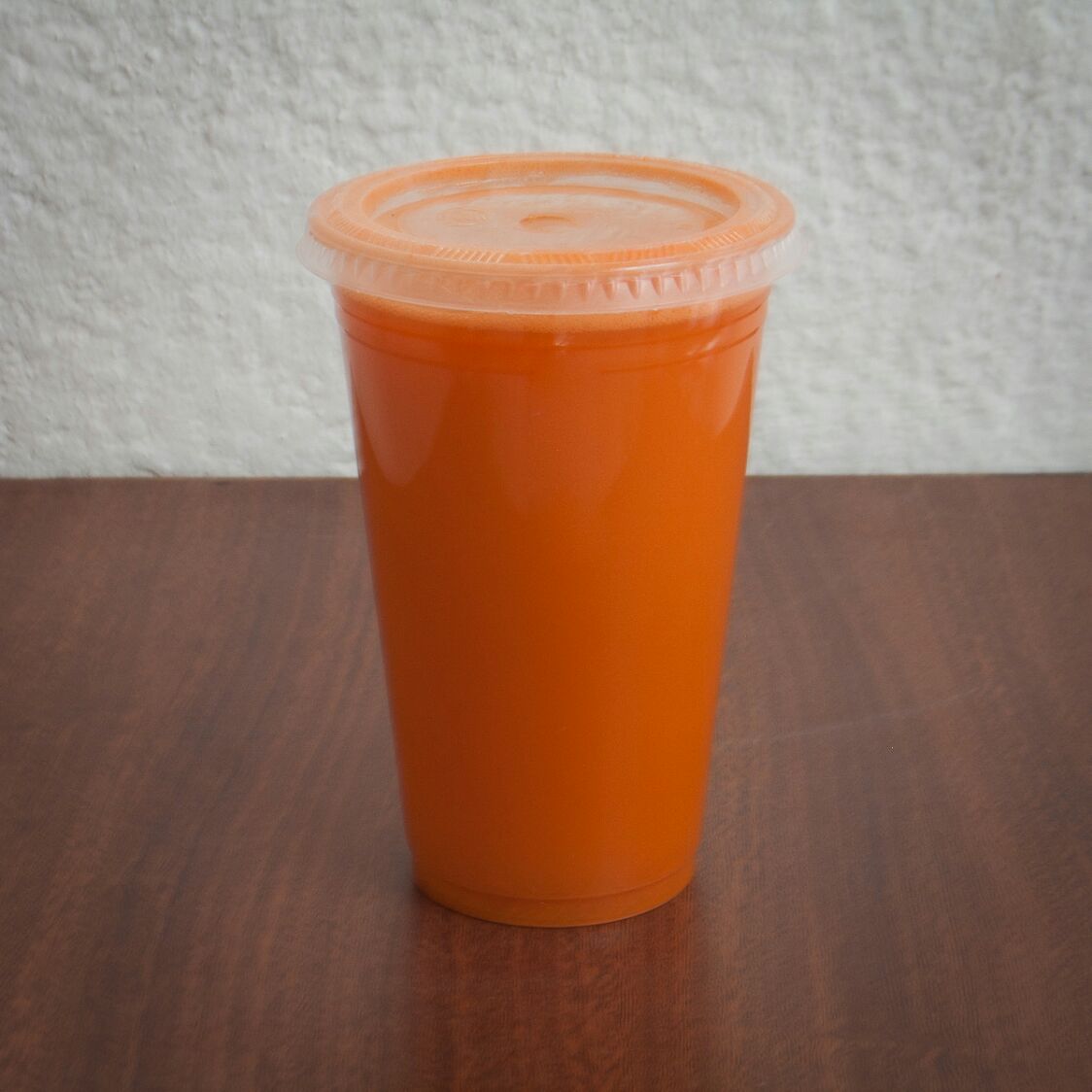 Refrescante jugo de zanahoria en un vaso de 16 oz.