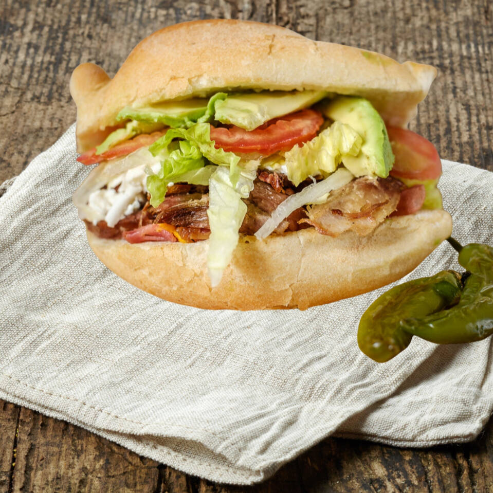Deliciosa torta cubana con milanesa de res empanizada,salchicha de pavo queso blanco y americano con lechuga jitomate y aguacate
