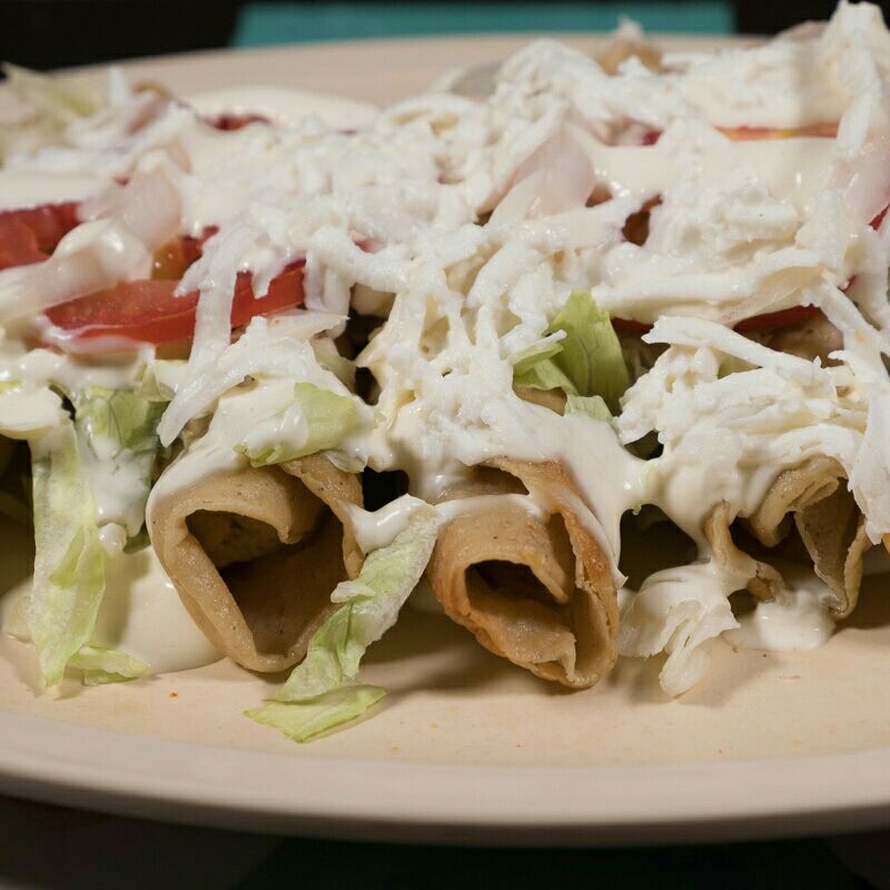 Deliciosas fautas doradas de pollo con lechuga,jitomate,queso y crema