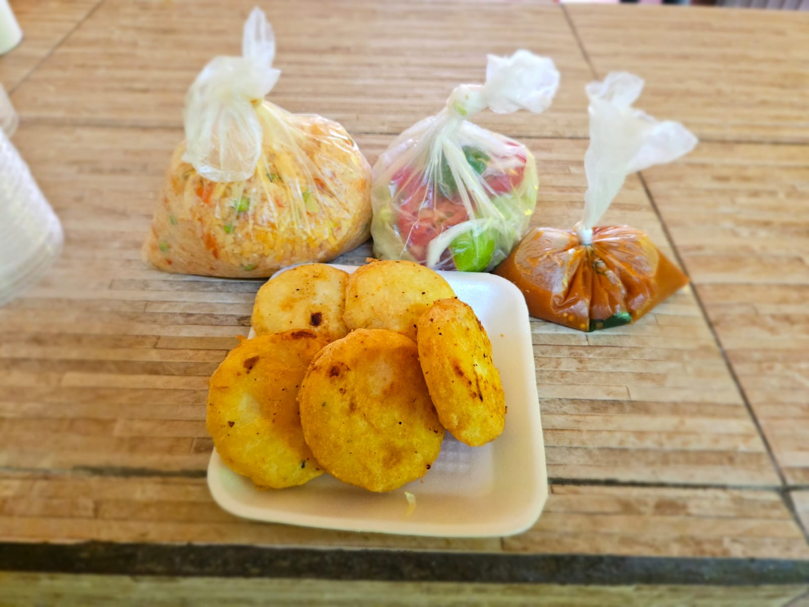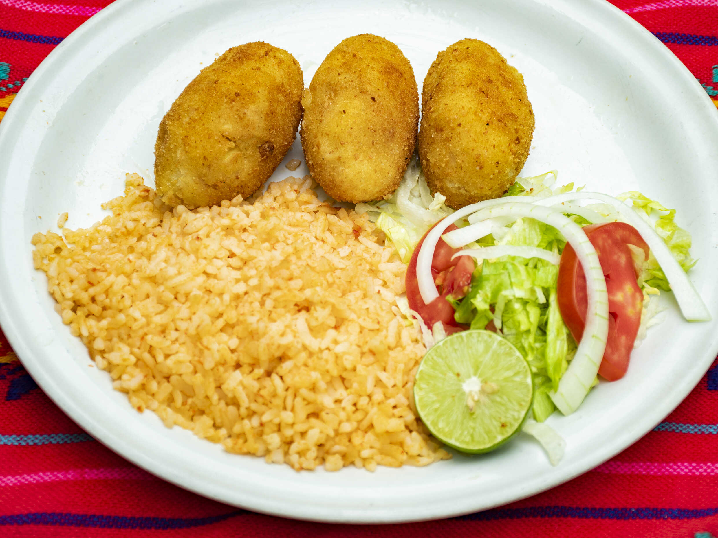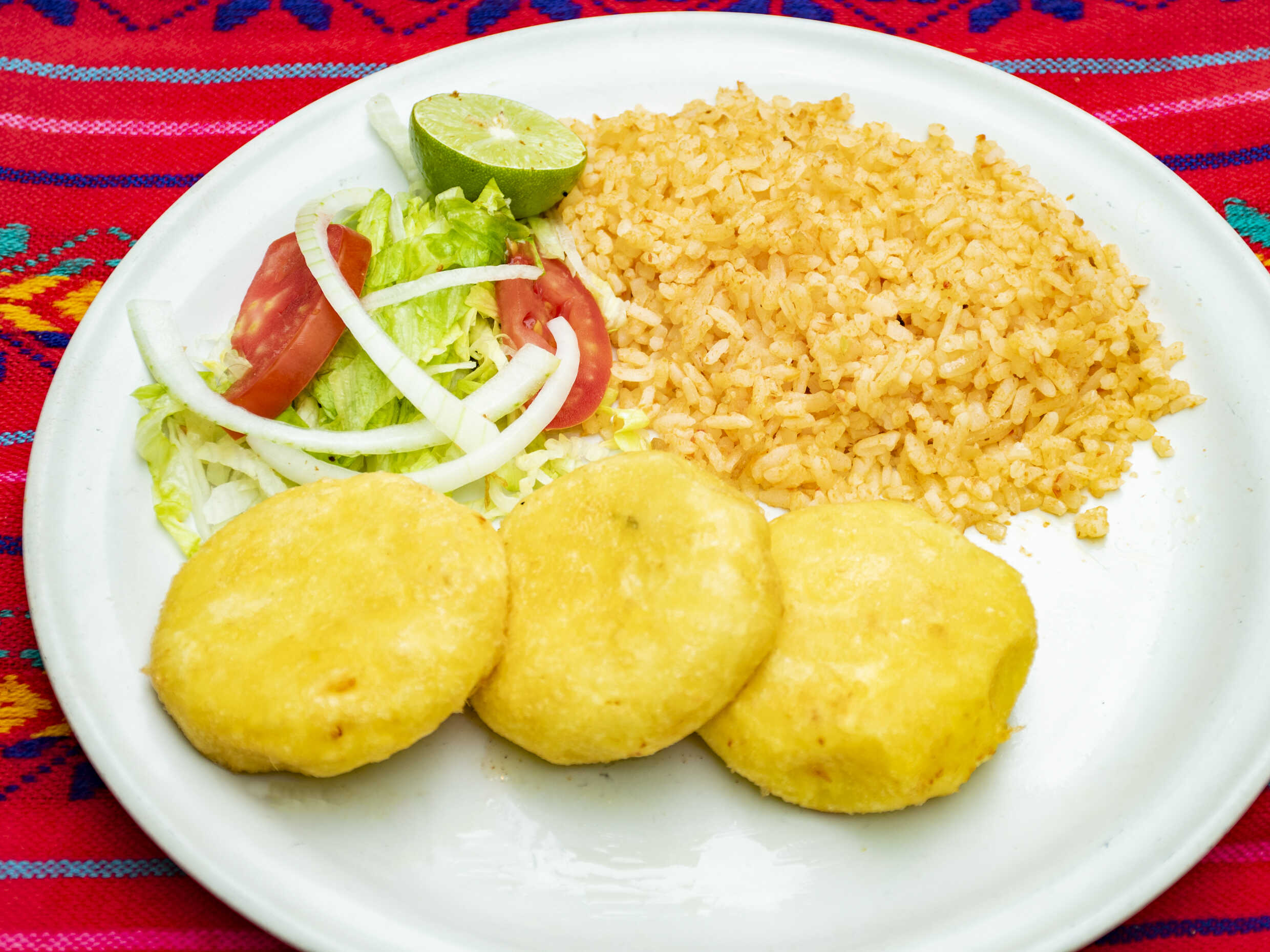 Con arroz frijoles y papás ensalada tortillas y salsa