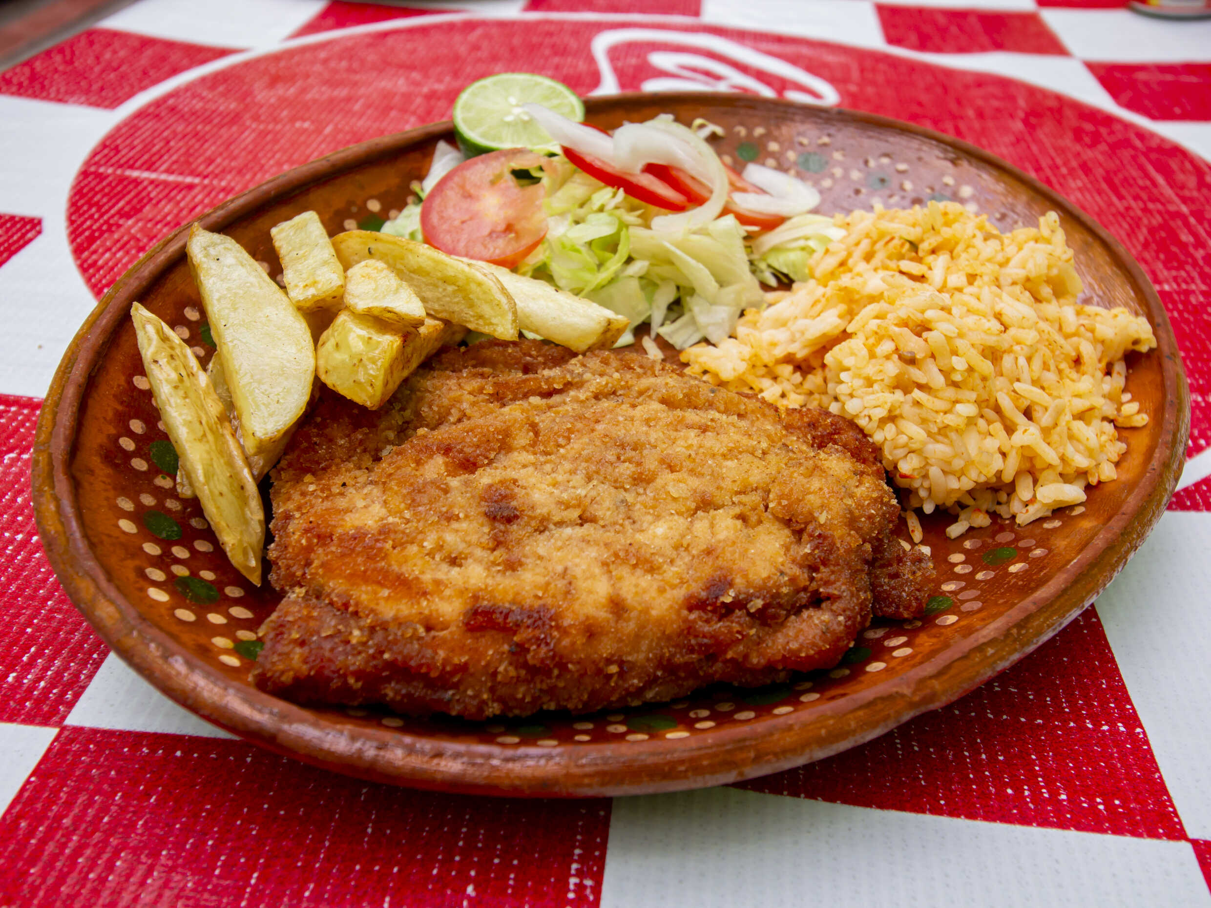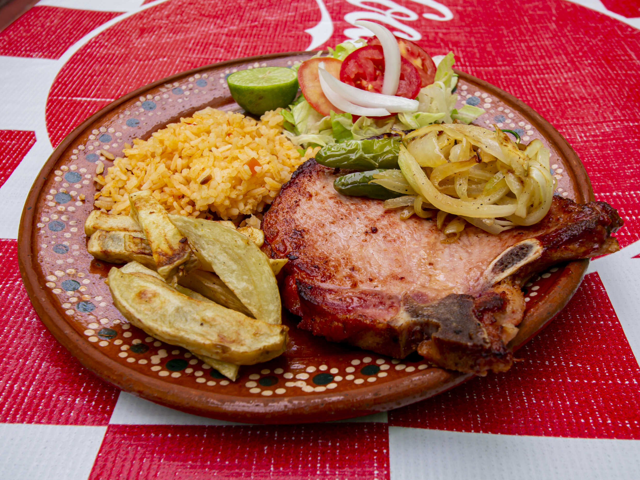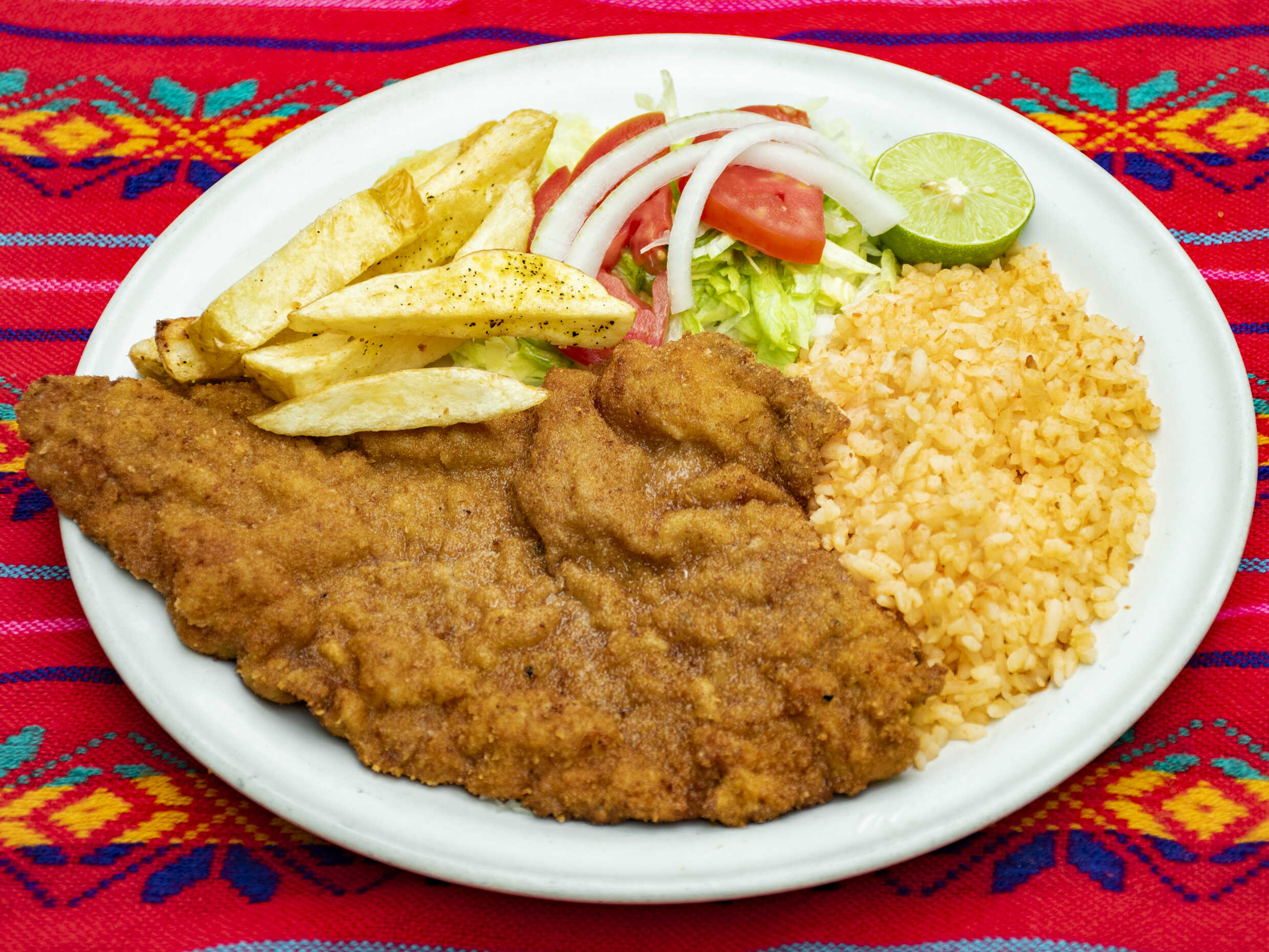 Con arroz frijoles y papás ensalada tortillas y salsa