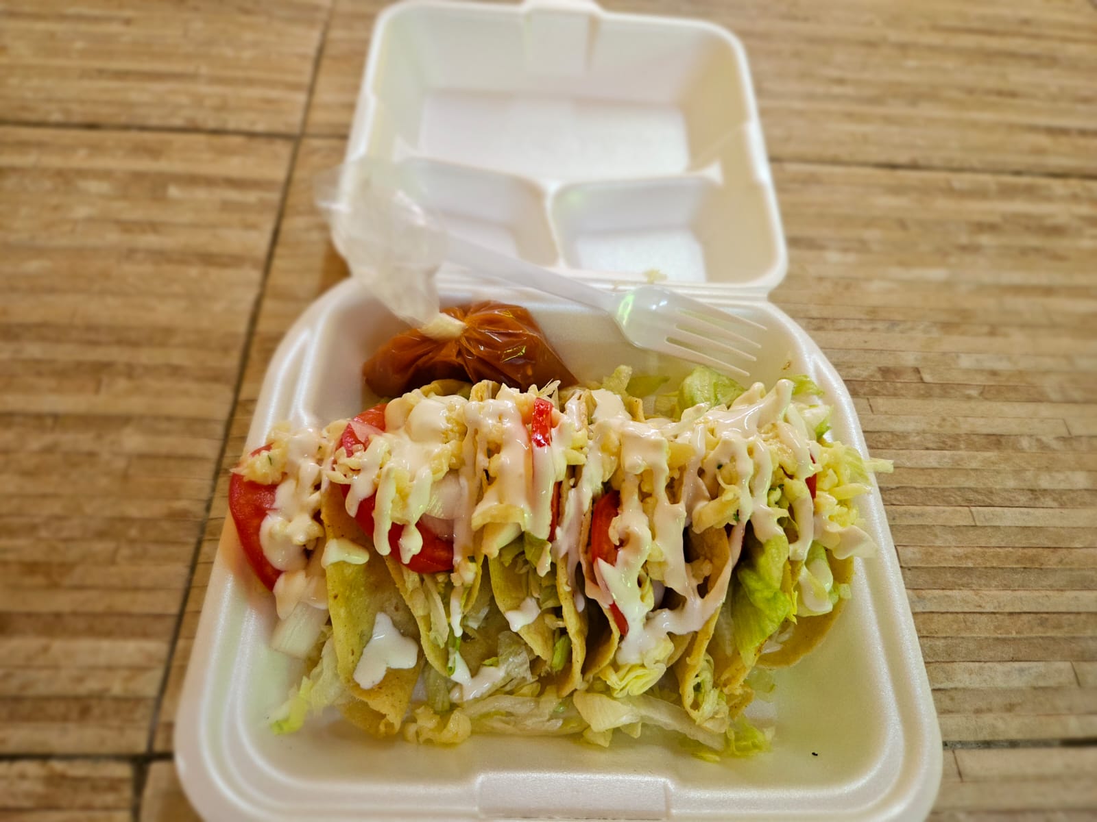 4 tortillas de maíz rellenas de pollo Acompañado de ensalada y papas fritas