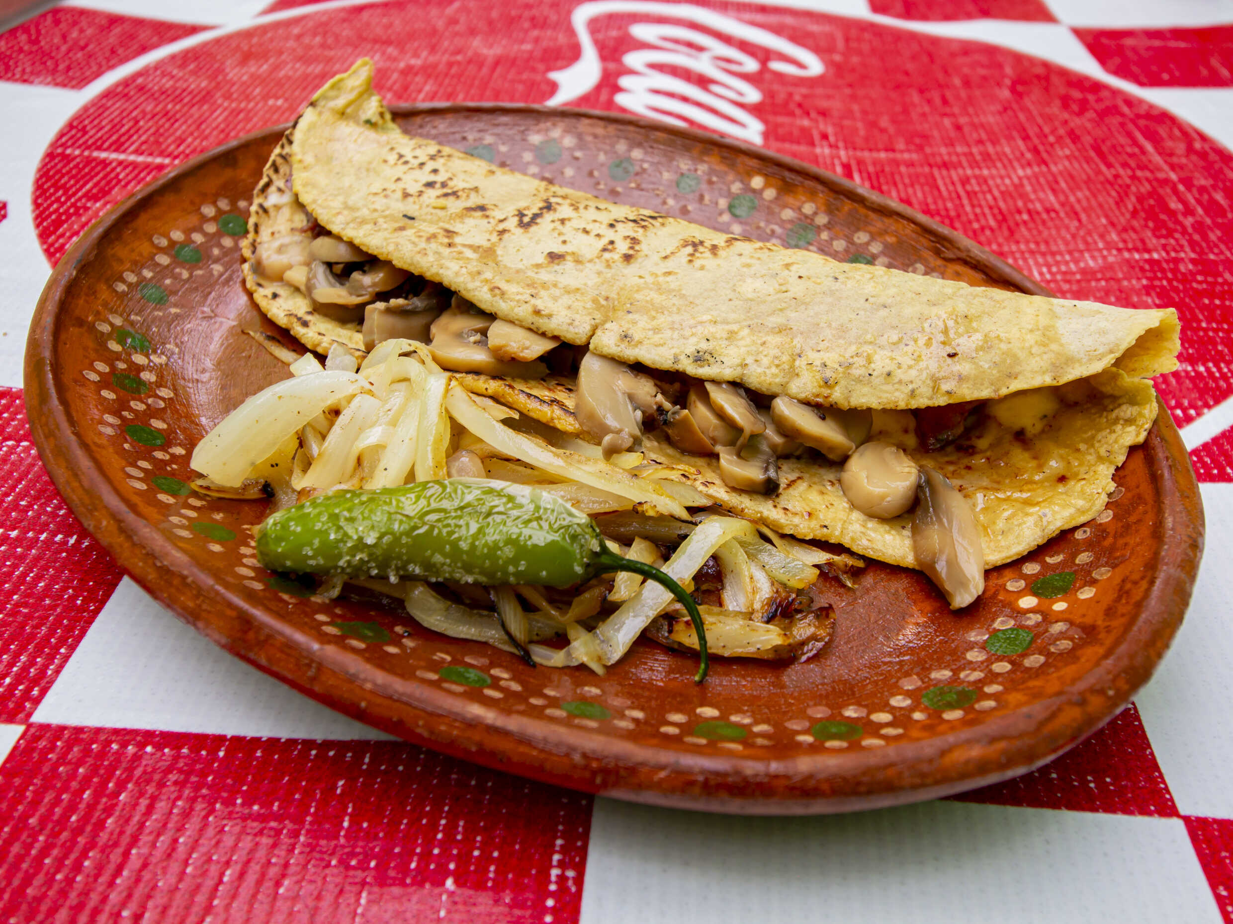 Champiñones queso Oaxaca cebollitas y chiles toreados