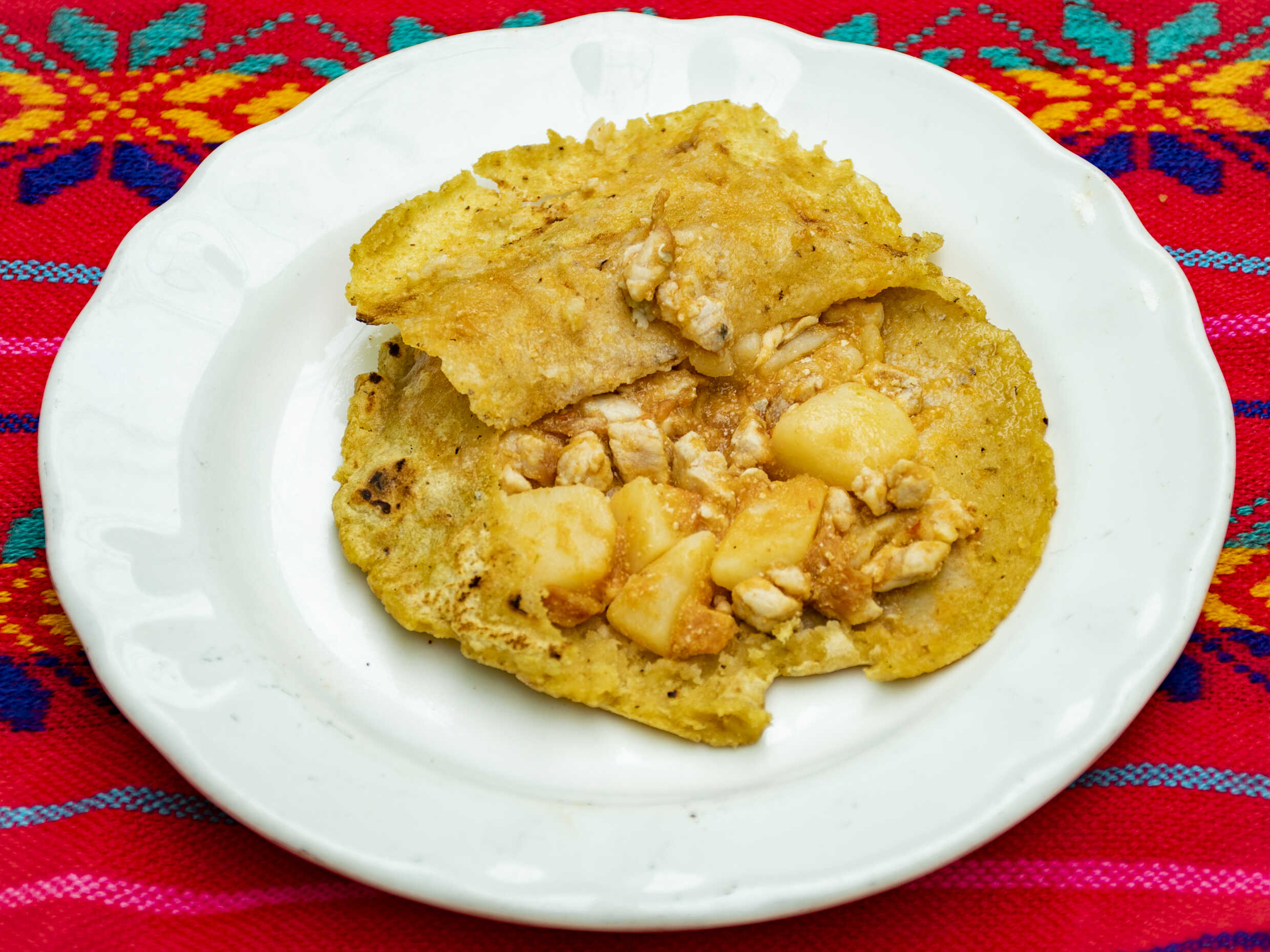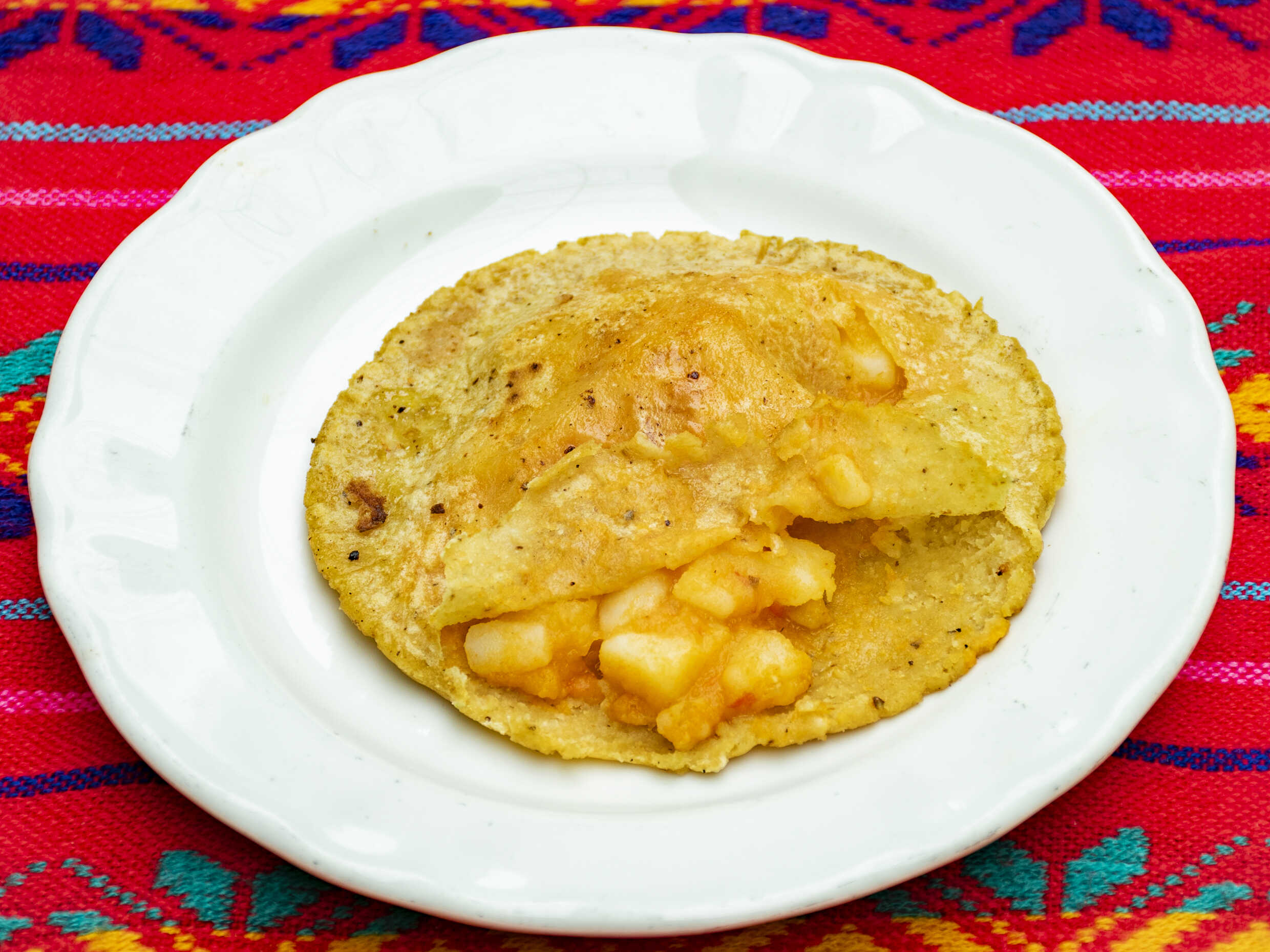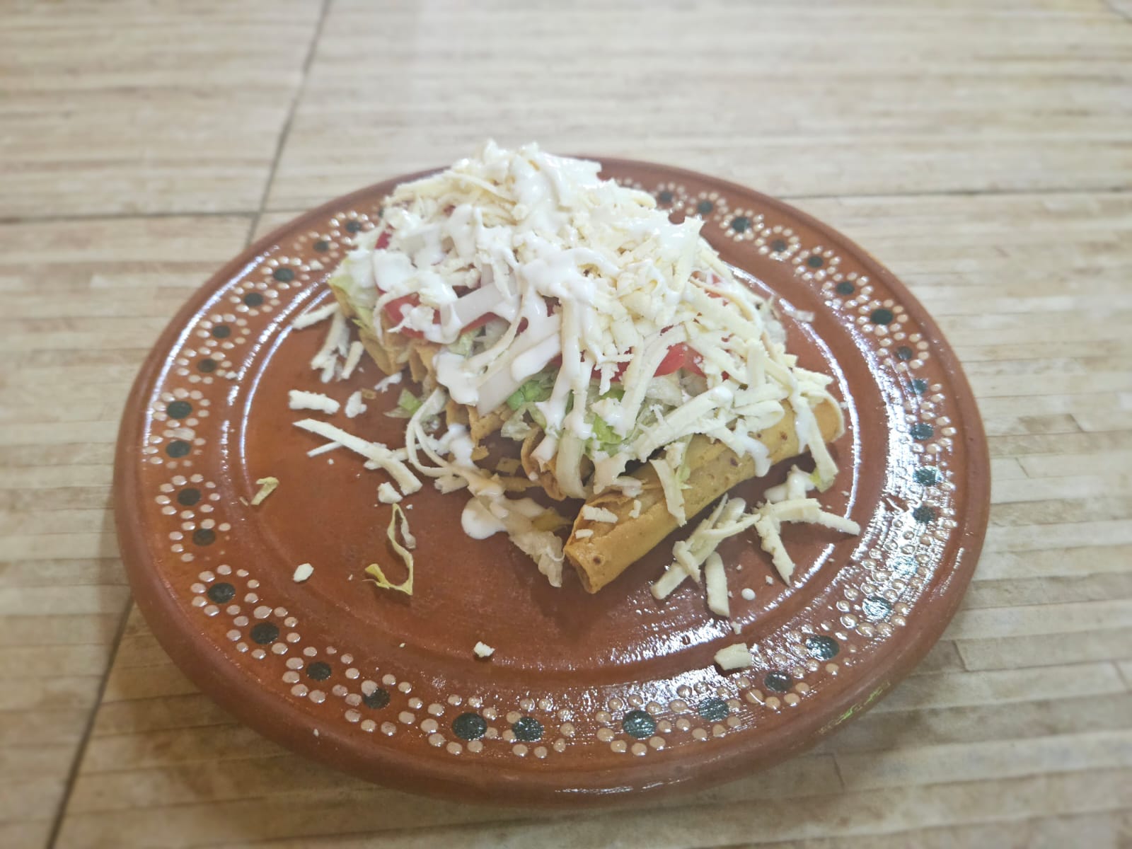 6 tortillas de maíz rellenas de papa preparadas lechuga jitomate cebolla crema y queso salsa