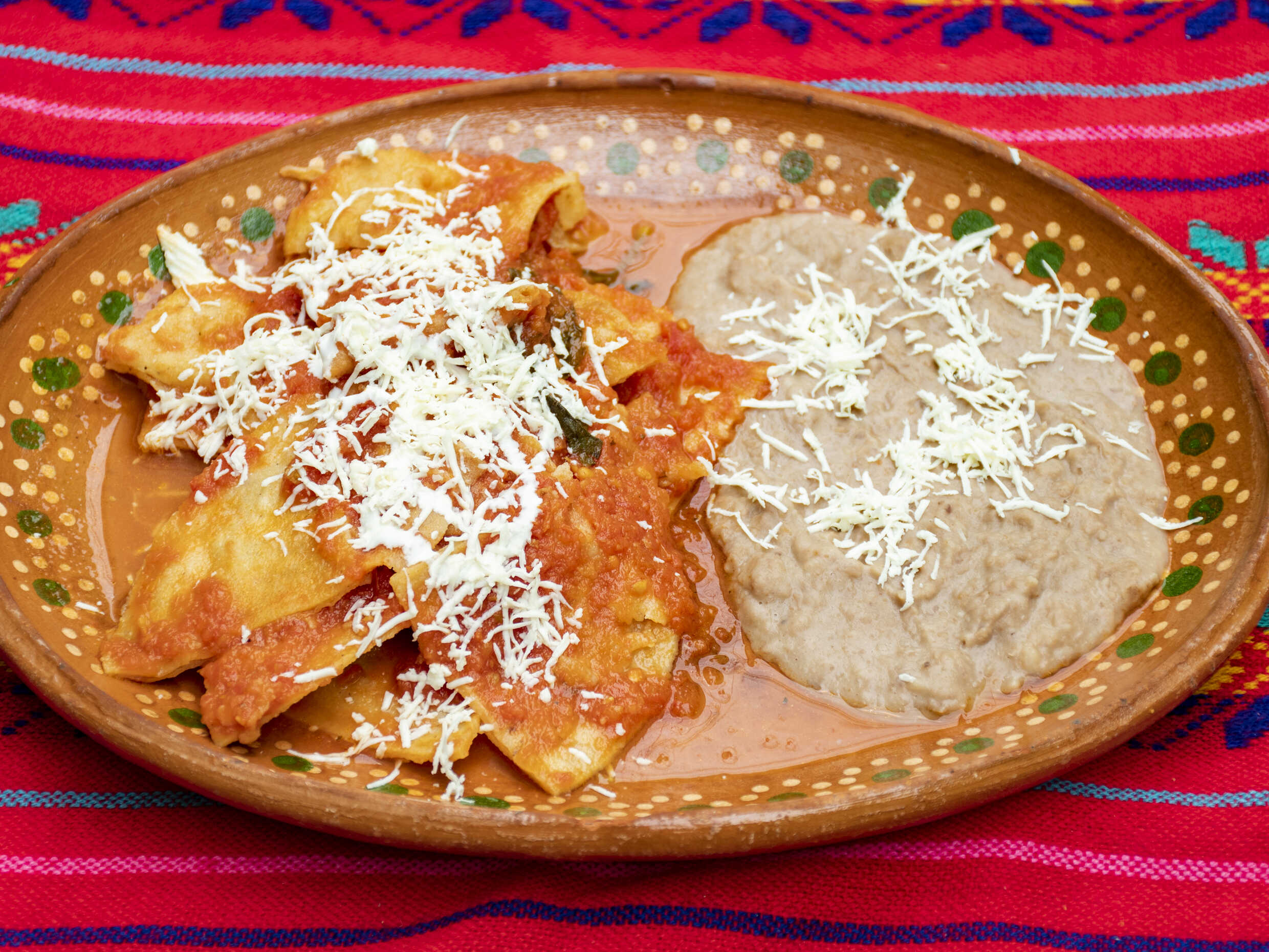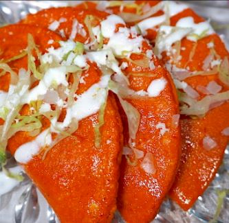 5 Uni * Enchiladas Potosinas con frijoles, cebolla, aguacate crema y queso.