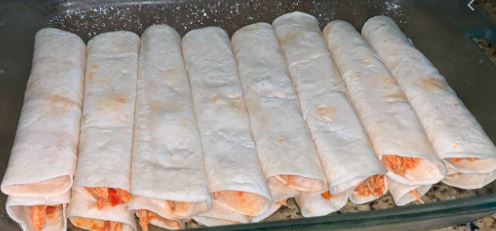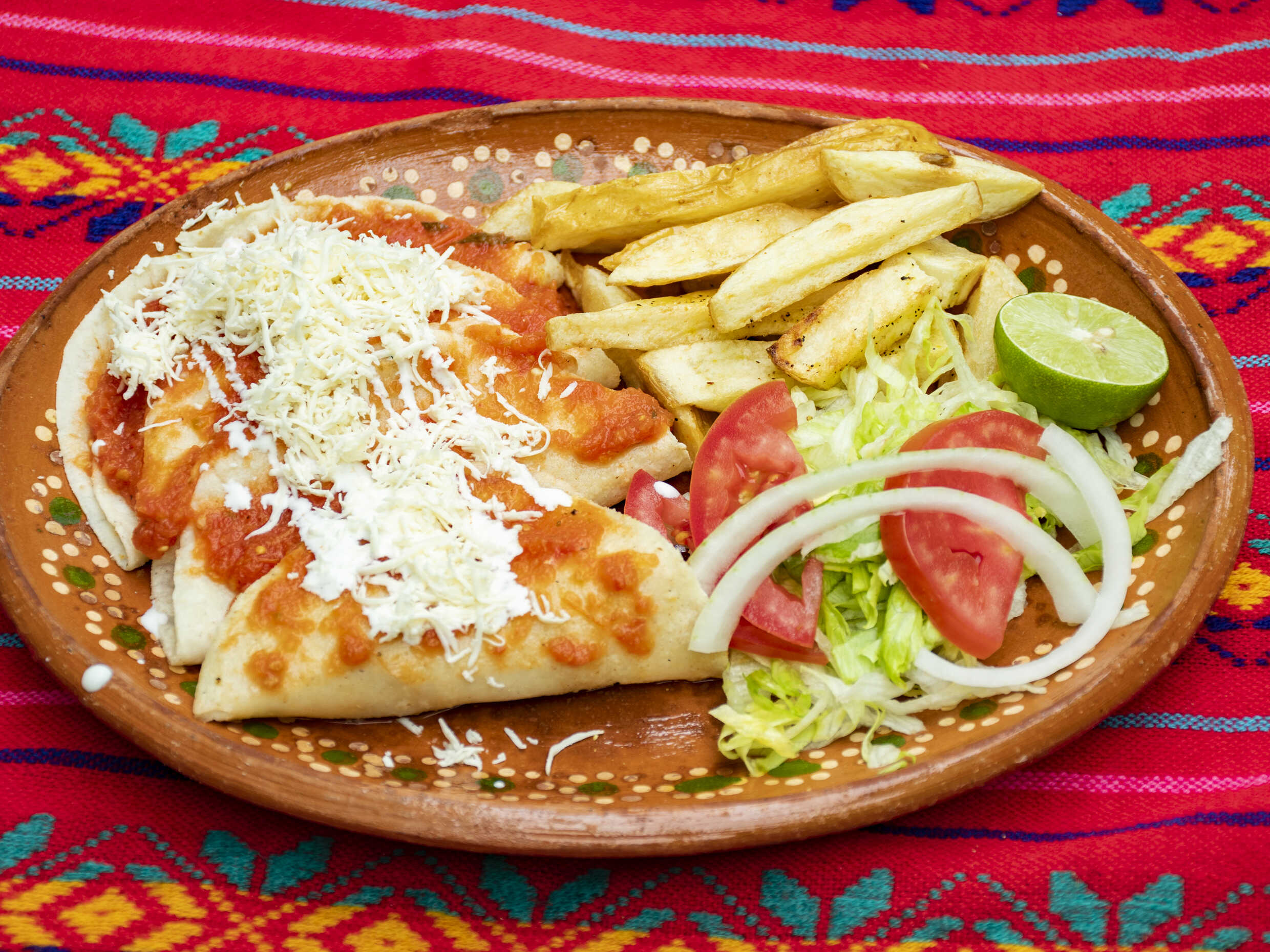 4 tortillas de maíz rellenas de pollo bañadas en na salsa de tomate acompañado de ensalada y papas fritas
