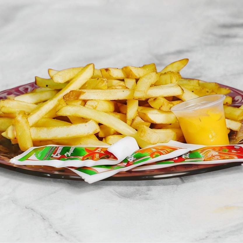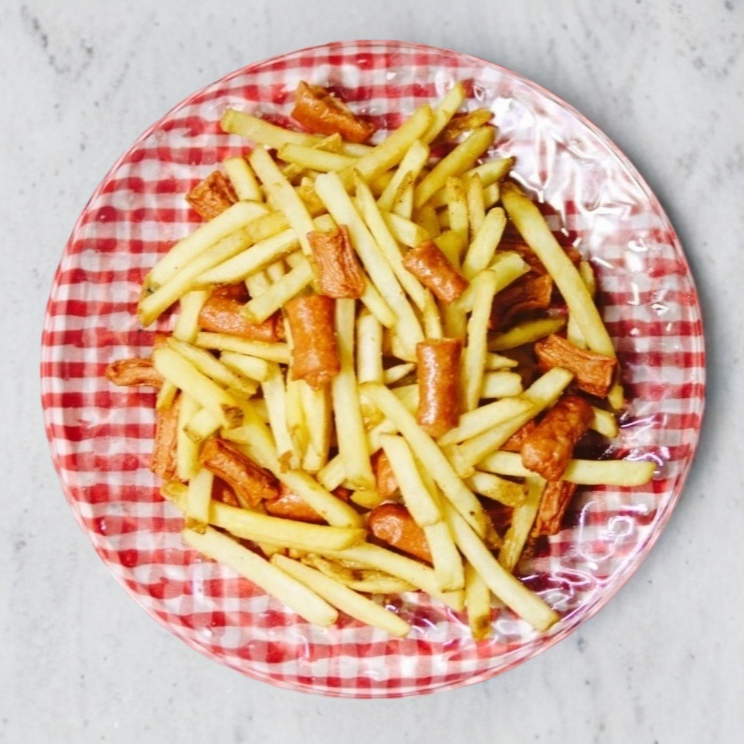Papas a la francesa acompañada de salchichas fritas.