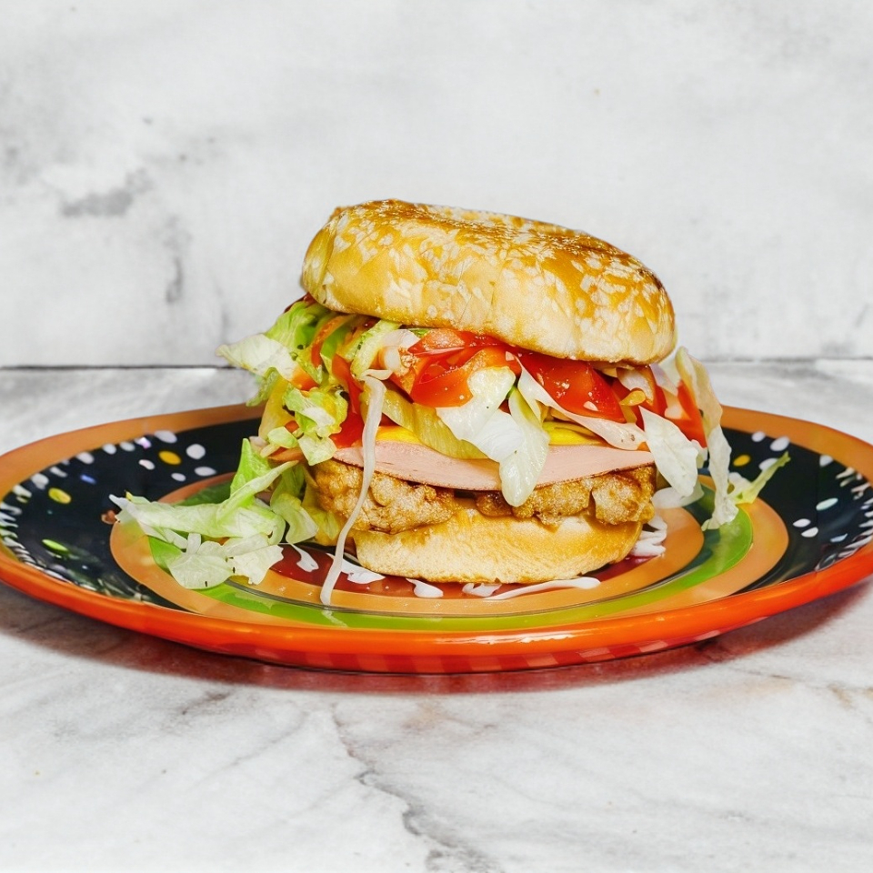 Rica hamburguesa, carne de puerco preparada en casa, mayonesa, jamon, queso amarrillo, queso asadero, lechuga, jitomate, chile envinagre, catsup.