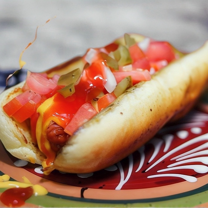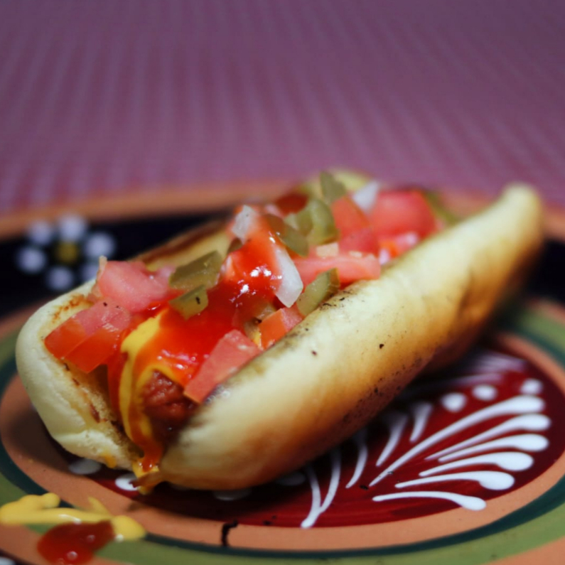 Rico hot-dog, pan, salchicha, jitomate, cebolla, chile, capsut, mayonesa y queso amarrillo.