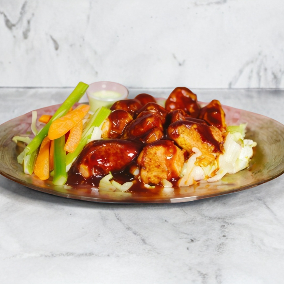 10pz de pechuga de pollo fritas, acompañado de bastones de pepino y zanahoria, un botesito de aderezo rach