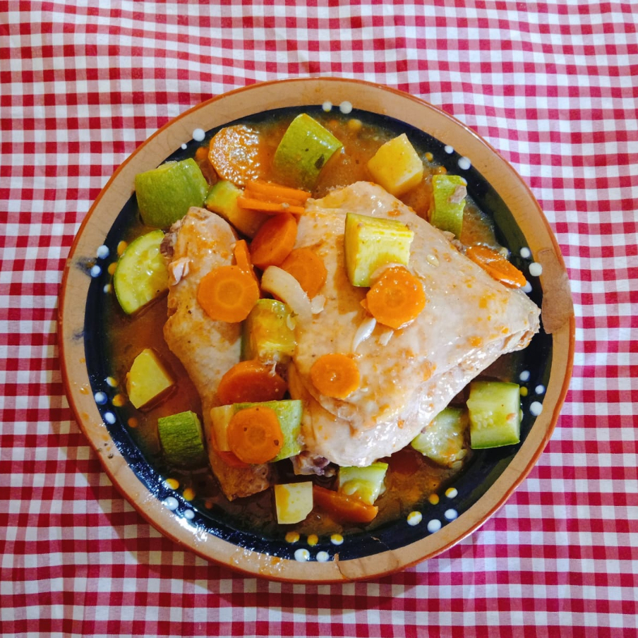 2 Piezas de Pollo fresco (pierna y muslo), En caldillo de jitomate acompañado de zanahoria, calabazas, papas y acelgas.. NO INCLUYE GUARNICION NI TPRTILLAS.