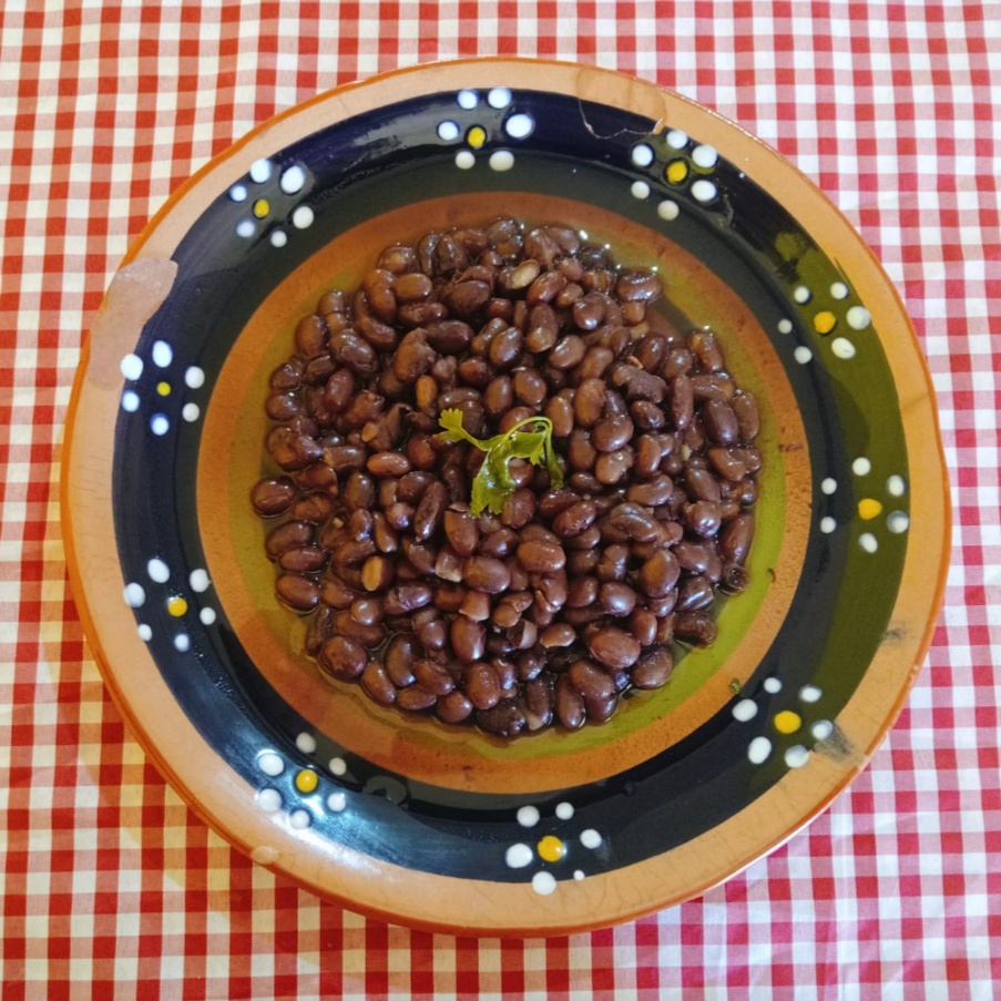 Frijoles Negros de la olla, sazonado con cilantro, cebolla y el sabor de la casa.