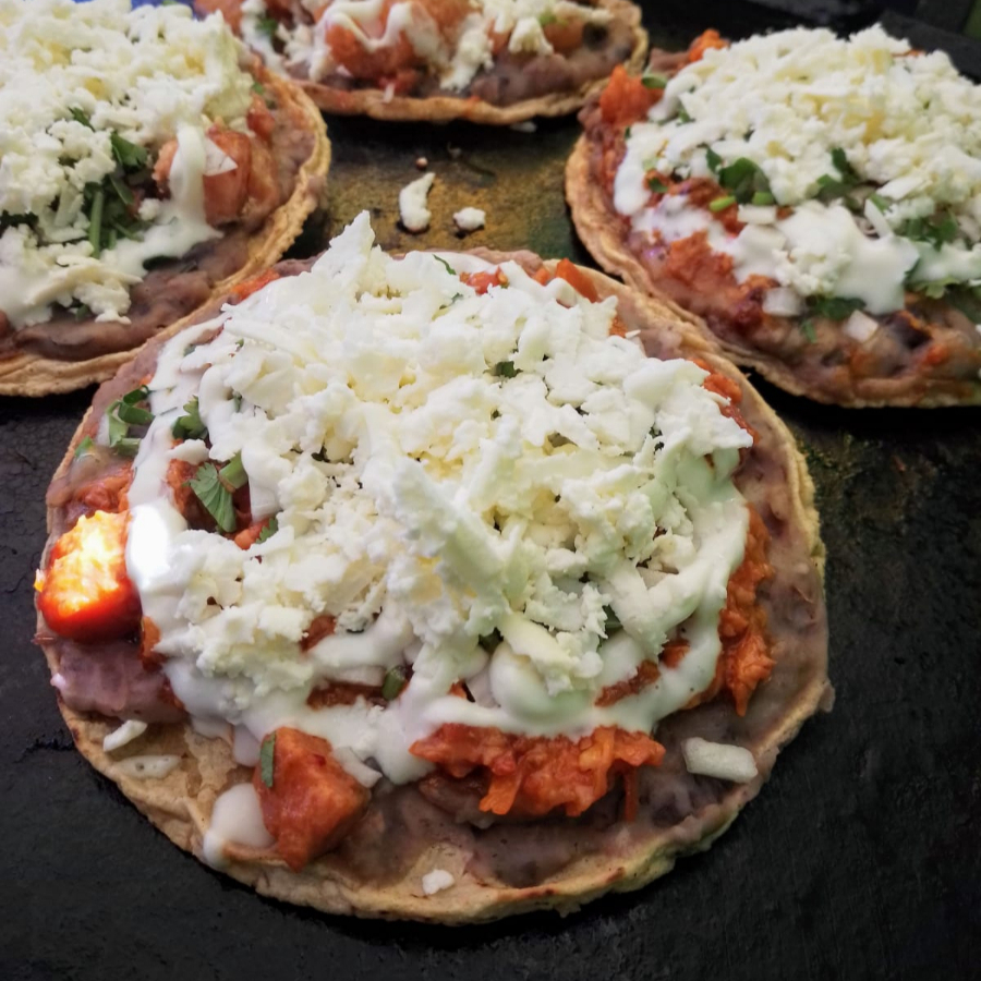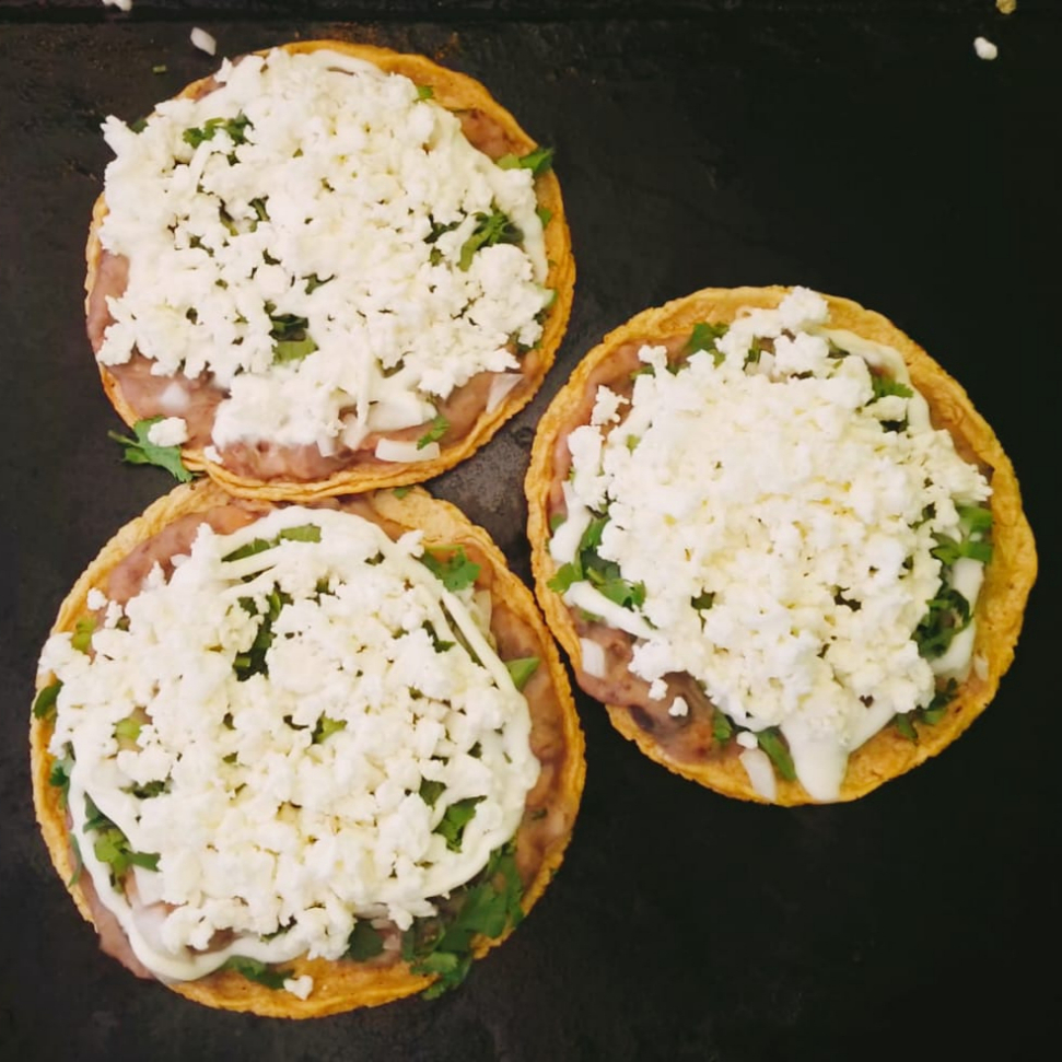 Sope de maiz, con frijoles, guisado de tu eleccion, cebolla, cilantro, crema y queso fresco.