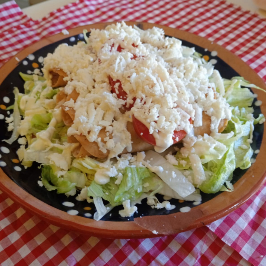 5 Piezas de Flautas rellenas de pollo acompañados de lechuga, jitomate, crema, queso y salsa.