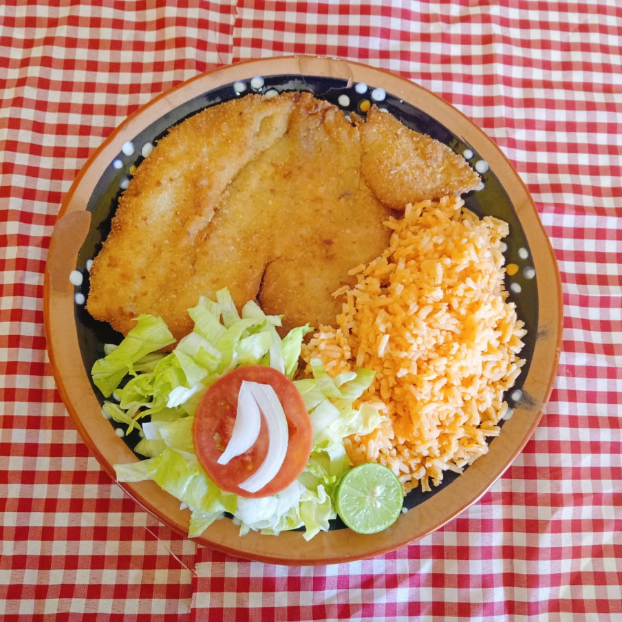 Filete Tilapia Empanizado acompañado de 2 guarniciones a elegir, 6pz tortillas y salsa.
