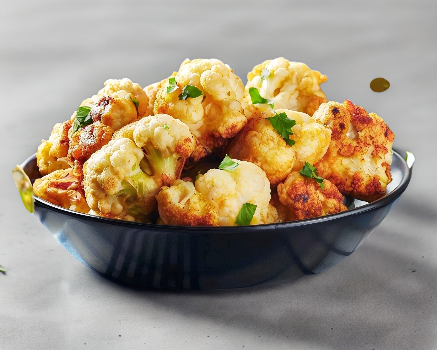 Platillo de dos coliflores capeadas en salsa de tomate, con arroz o espagueti y ensalada.