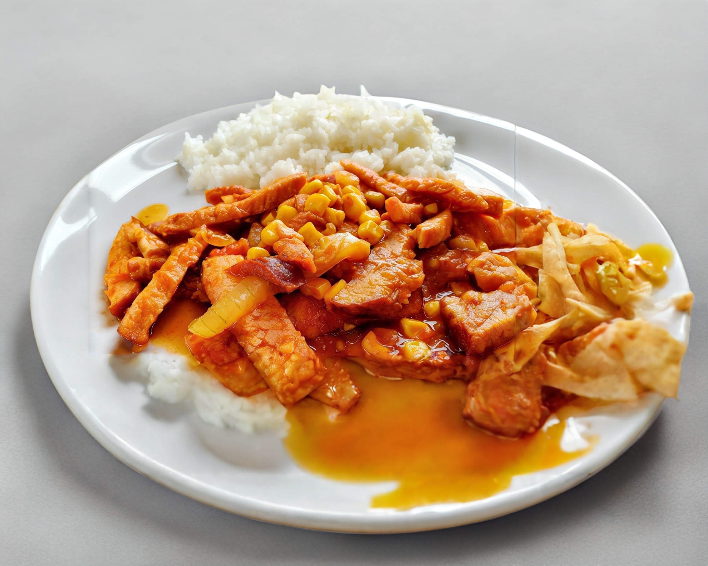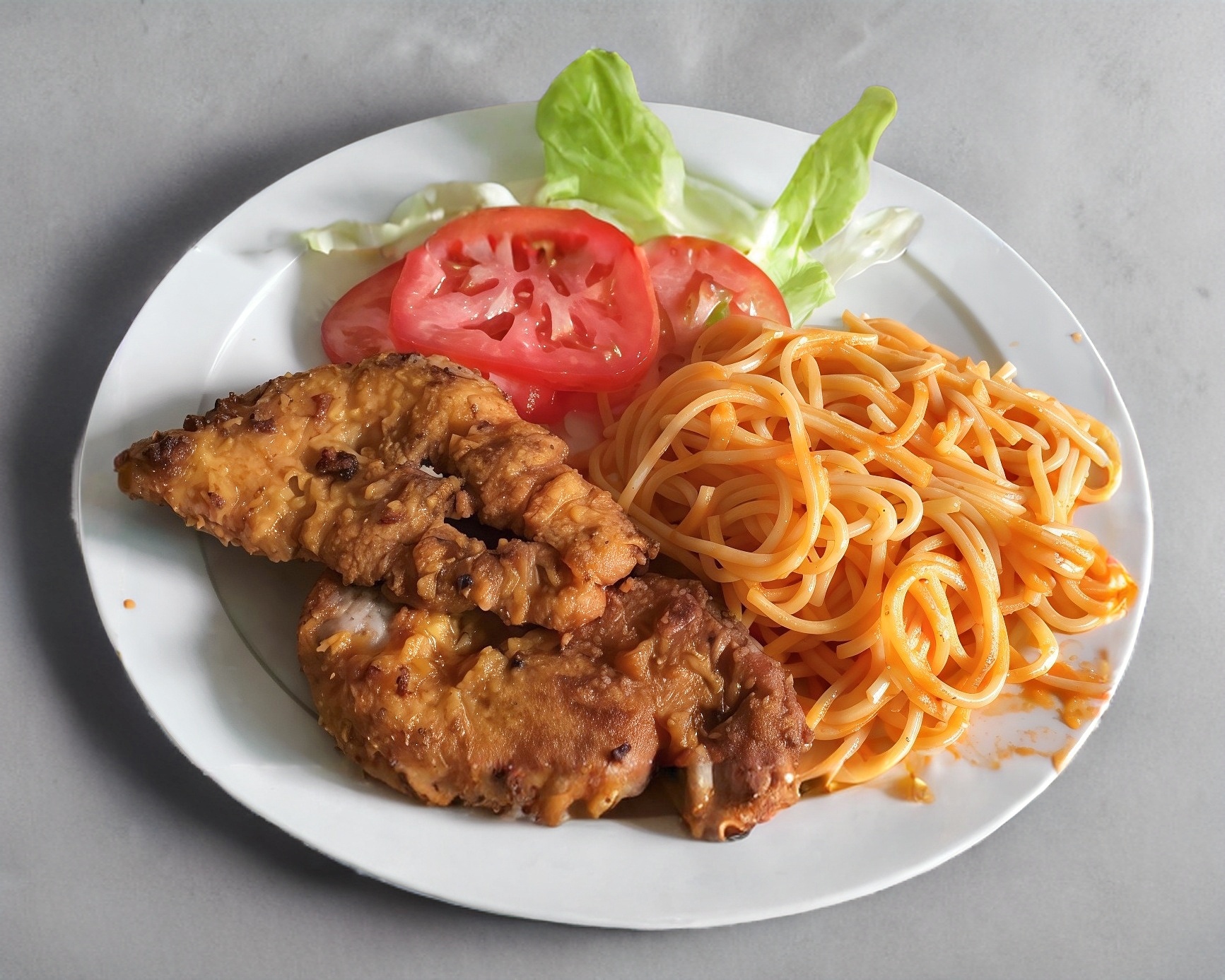 Platillo de chuleta ahumada guisada, elige la pasta de tu preferencia (arroz o espagueti) y un acompañamiento (ensalada o frijoles), incluye tortillas y salsa.