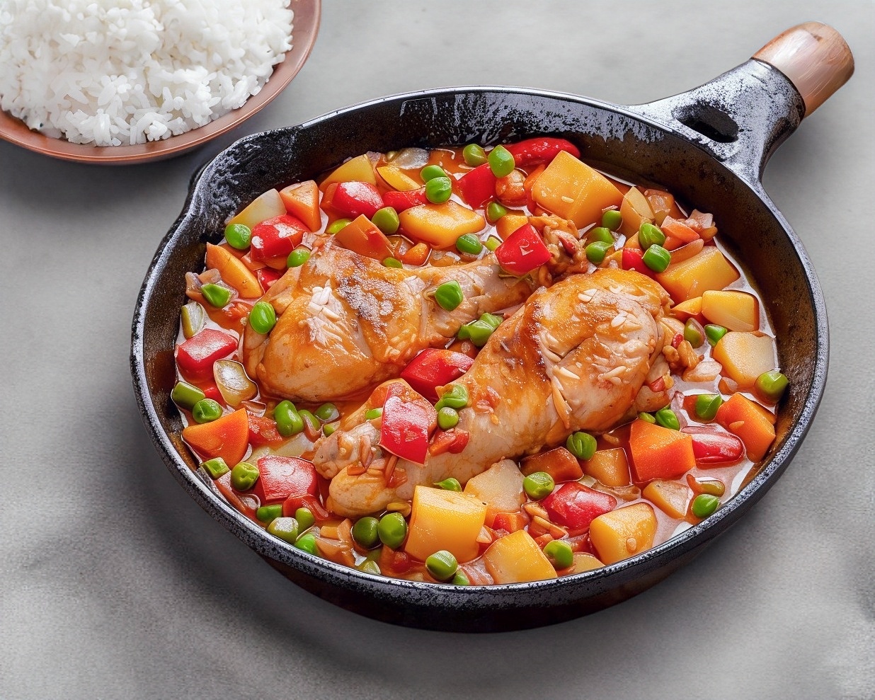 Pollo deshebrado a la jardinera con arroz o espagueti, frijoles negros o ensalada.