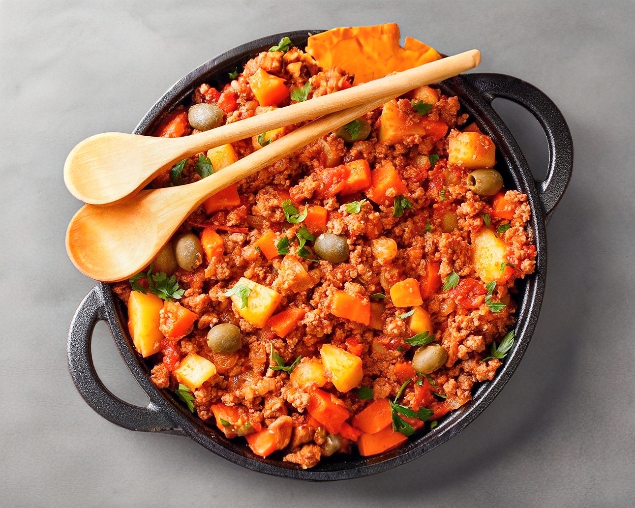 Porción de guisado de picadillo de res, acompáñalo con tu pasta favorita (arroz o espagueti) y una complemento (frijoles o ensalada), incluye tortillas y salsa aparte.