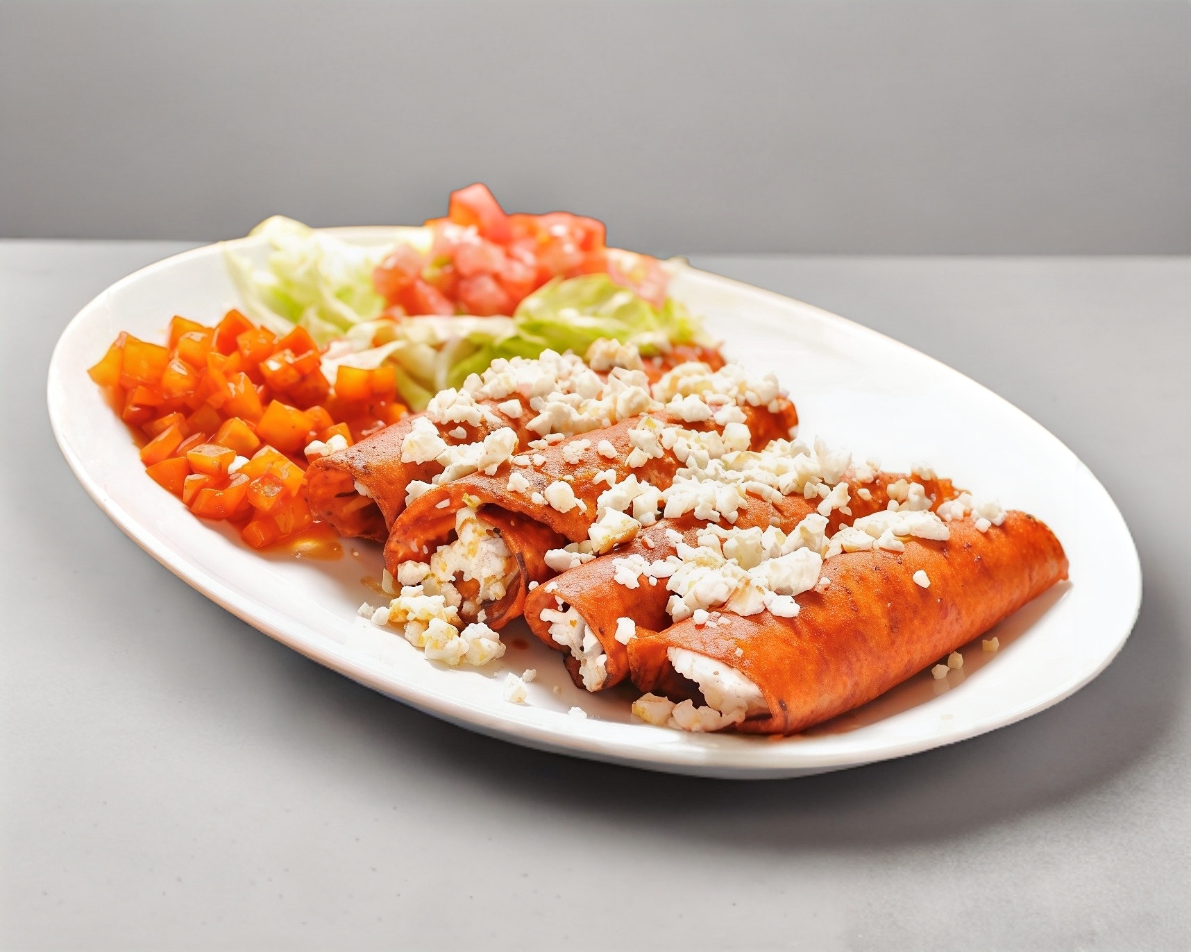 Platillo de 5 enchiladas huastecas con cecina, arroz, ensalada y frijoles negros.