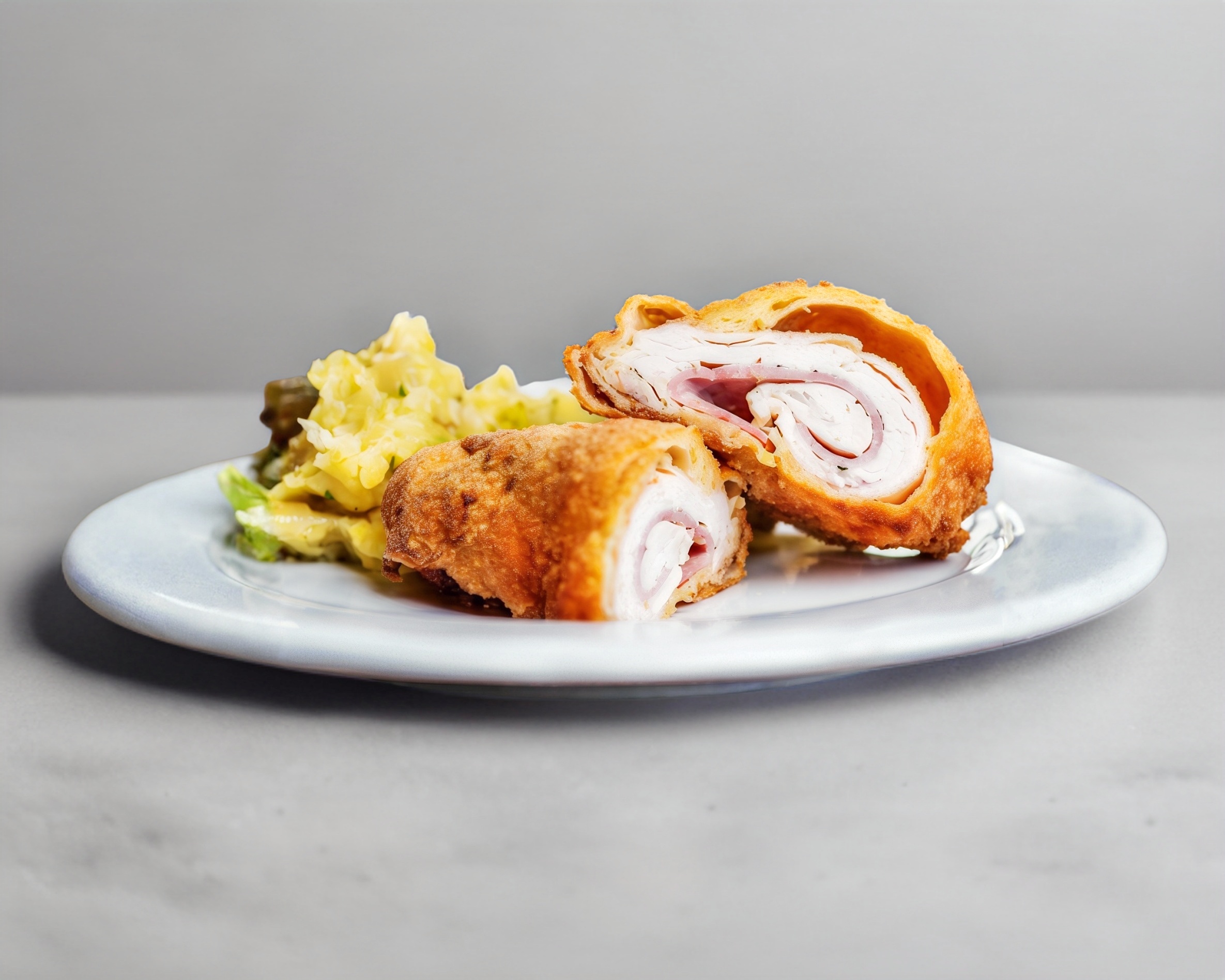 Doble pechuga rellena con queso amarillo y jamón de pavo acompañado de espagueti o arroz y ensalada.