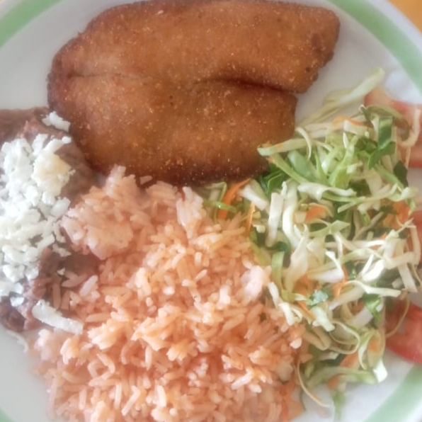 Milanesa de Pezcado, arroz y frijoles