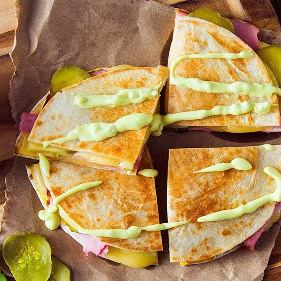 Deliciosa sincronizada preparada con tortilla de harina, jamón y queso perfectamente derretido.