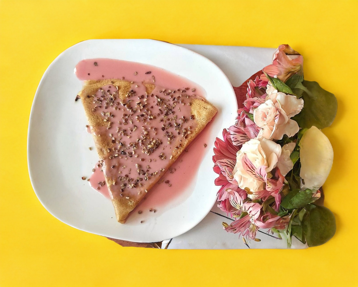 Crepa rellena de Philadelphia, nuez y piñón, bañada en un licor de piñón rosa Chatello.