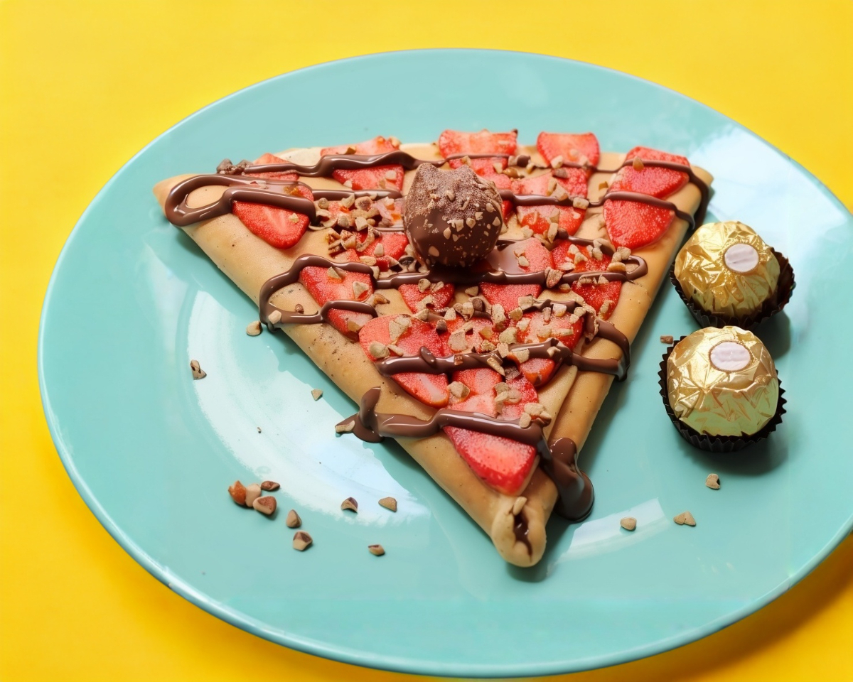 Deliciosa crepa con relleno de crema de avellanas, nuez, fresa natural y chocolate Ferrero.