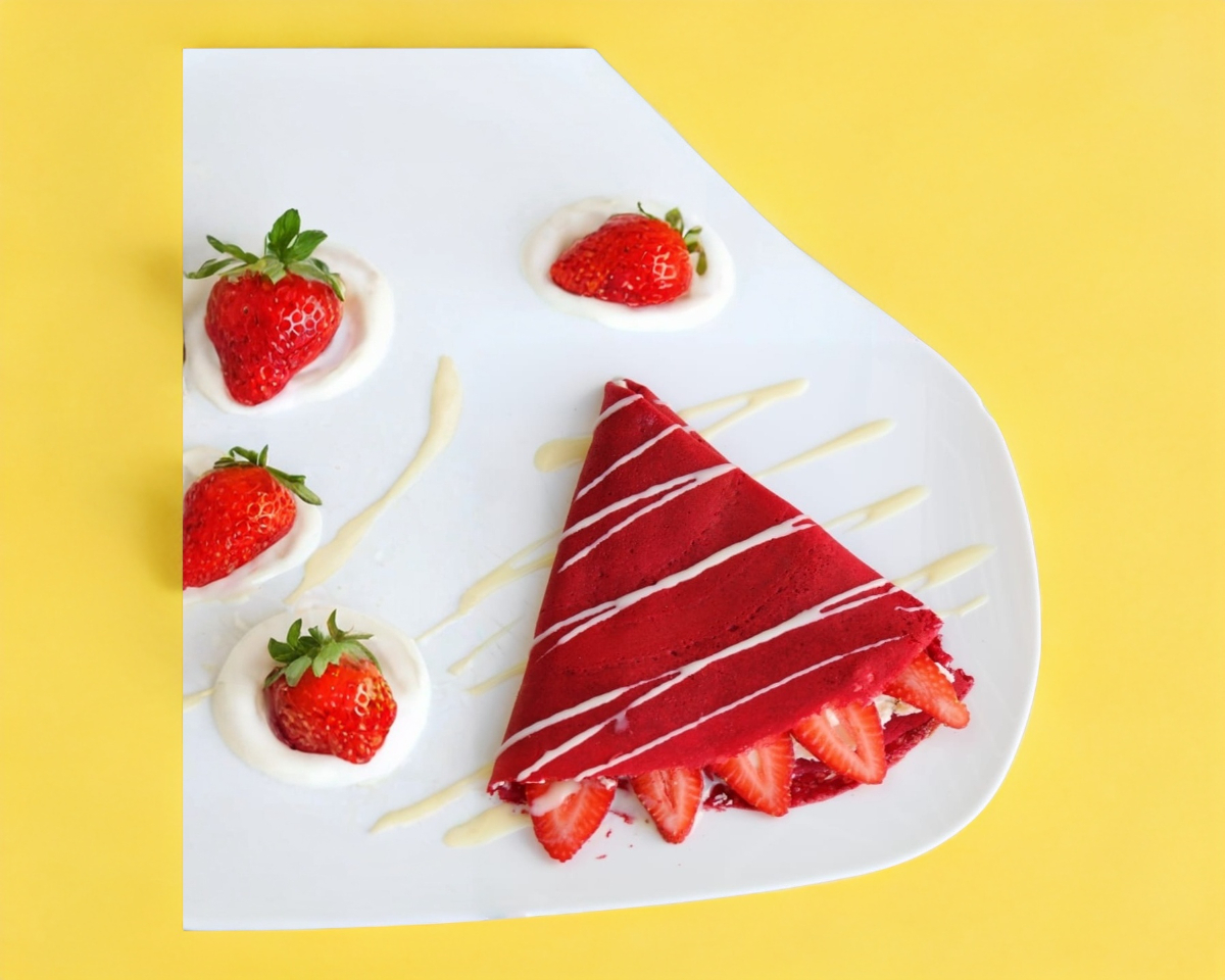 Deliciosa crepa elaborada con masa red velvet, queso Philadelphia, fresas naturales y un toque de lechera.