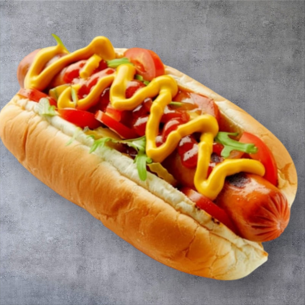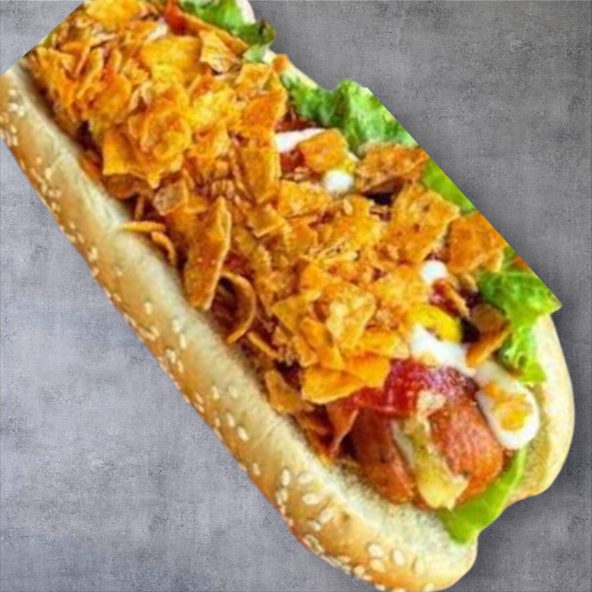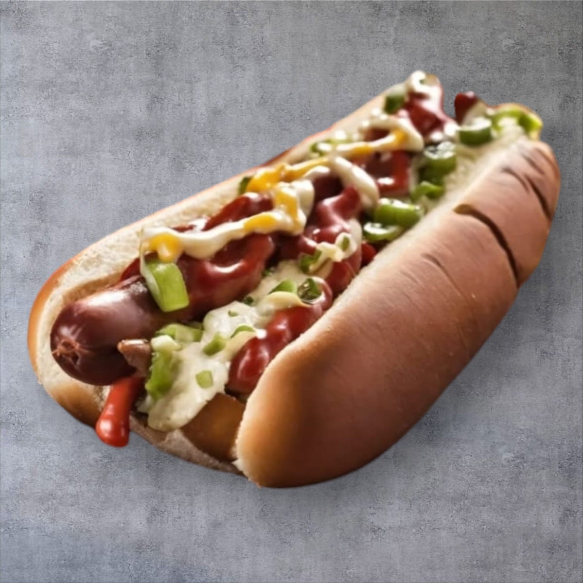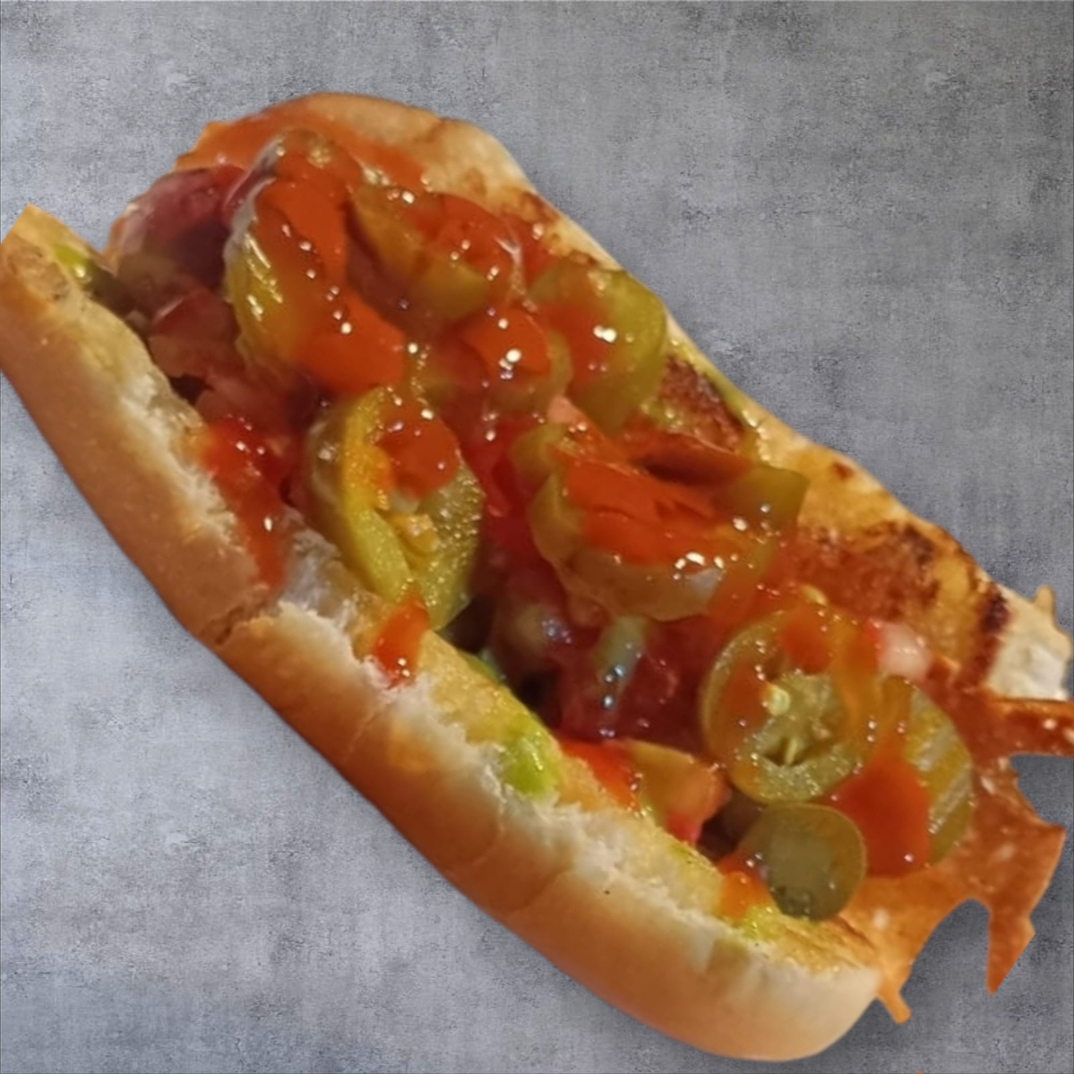 Salchicha 100% Res, Pan 20 cm. con Ajonjolí, Queso Gratinado Monterrey Jack, aderezos, (jito y jalp)