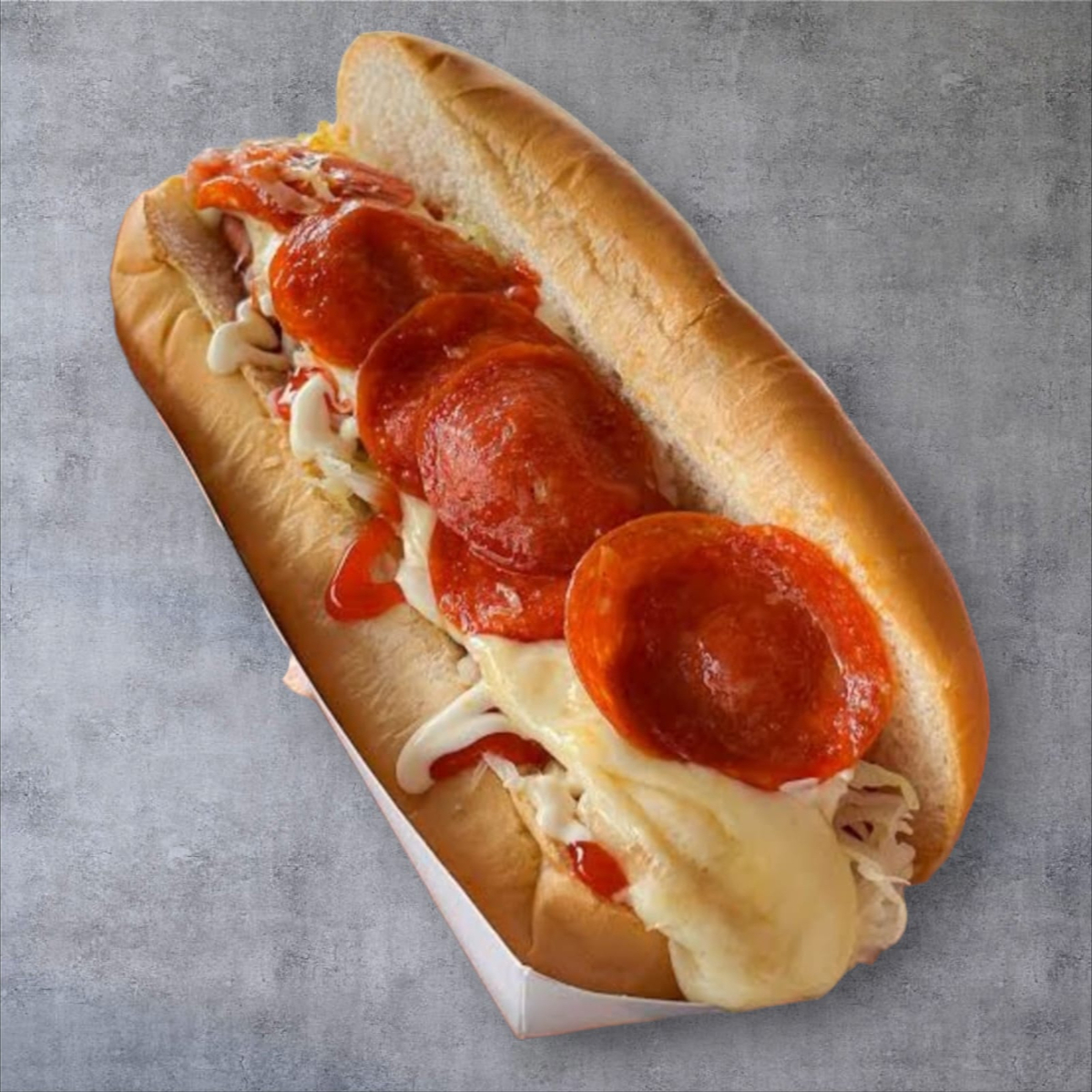 Peperoni, salchicha de pavo, pan tradicional, queso Monterrey Jack, aderezos, (jito, ceb y jalp)