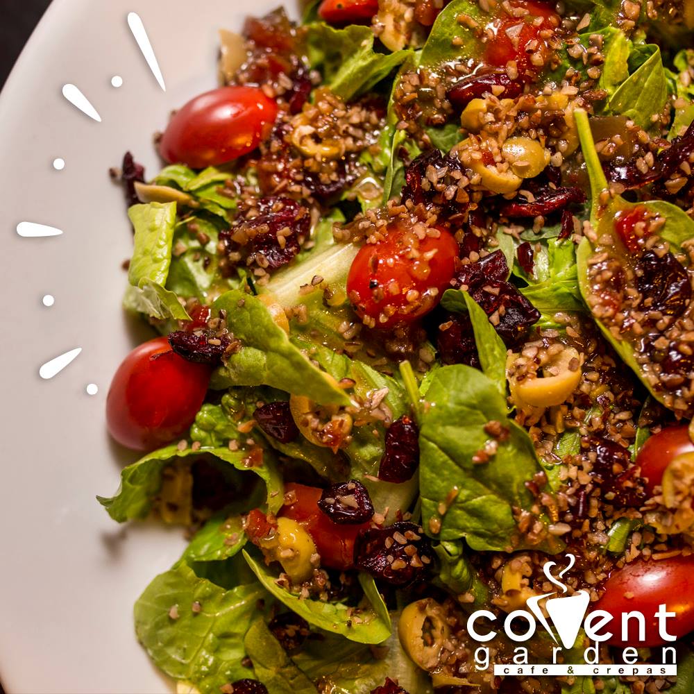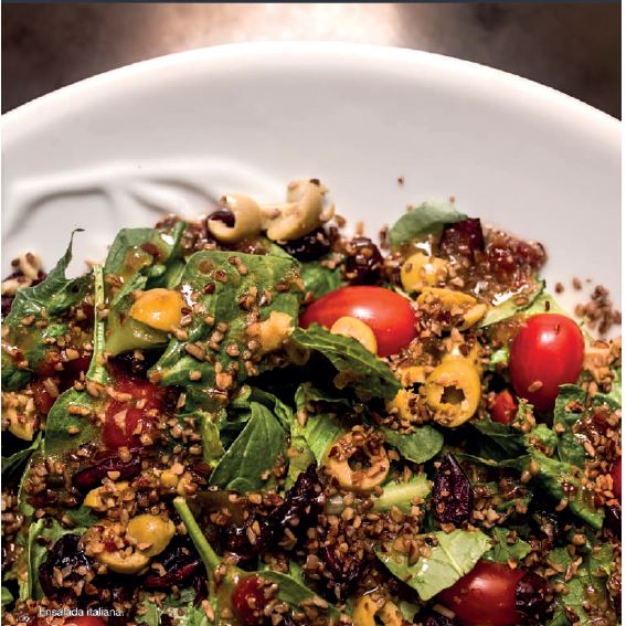 Lechuga orejona, espinacas, nuez, arándanos, aceitunas, tomate cherry y aderezo italiano.