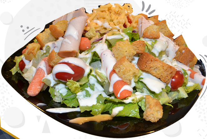Lechuga orejona, tomate cherry, zanahoria baby, pechuga de pavo o pollo, aderezo ranch, crutones y queso a elegir