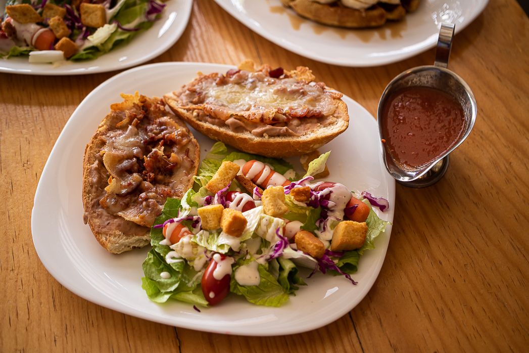 Medio bolillo con frijoles, tocino y queso. 2 piezas. Acompañados de guarnción de ensalada césar.